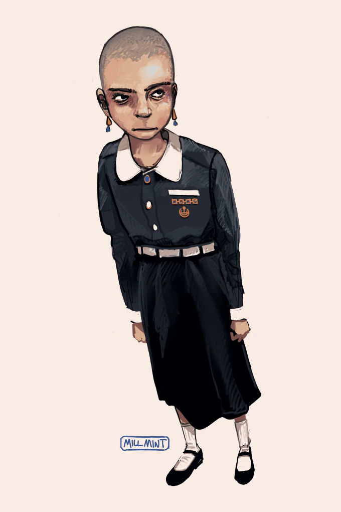 Lin Zhi resents the burden of integration and demonstrates her foreignness through foreign styles, usually with traditional Chinese items or more contemporary Maoist fare. She wears loose Ku-style pants at home and school, which bear close similarity to Vekllei trousers. She has a weakness for jackets and cardigans, and never leaves her arms uncovered.