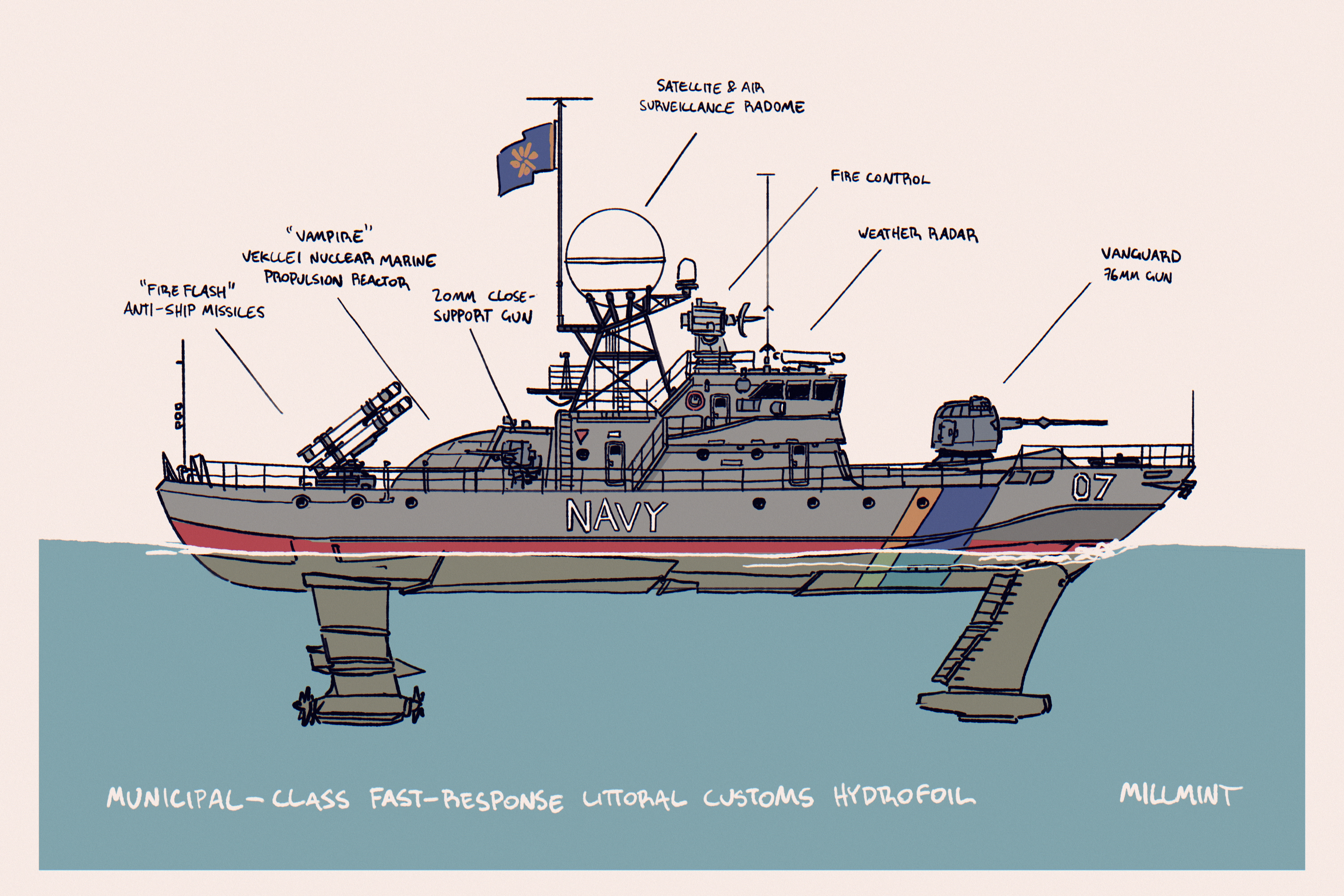 The Municipal-class Hydrofoil is a class of fast-response hydrofoils mostly used by the Littoral Service of the Marine Services of Vekllei. They serve as interceptors in Vekllei territorial waters and exclusive economic zones, a mission aided by their heavy complement of anti-ship missiles and a 76mm gun. They are also the smallest nuclear-powered ship in the Armed Forces.
