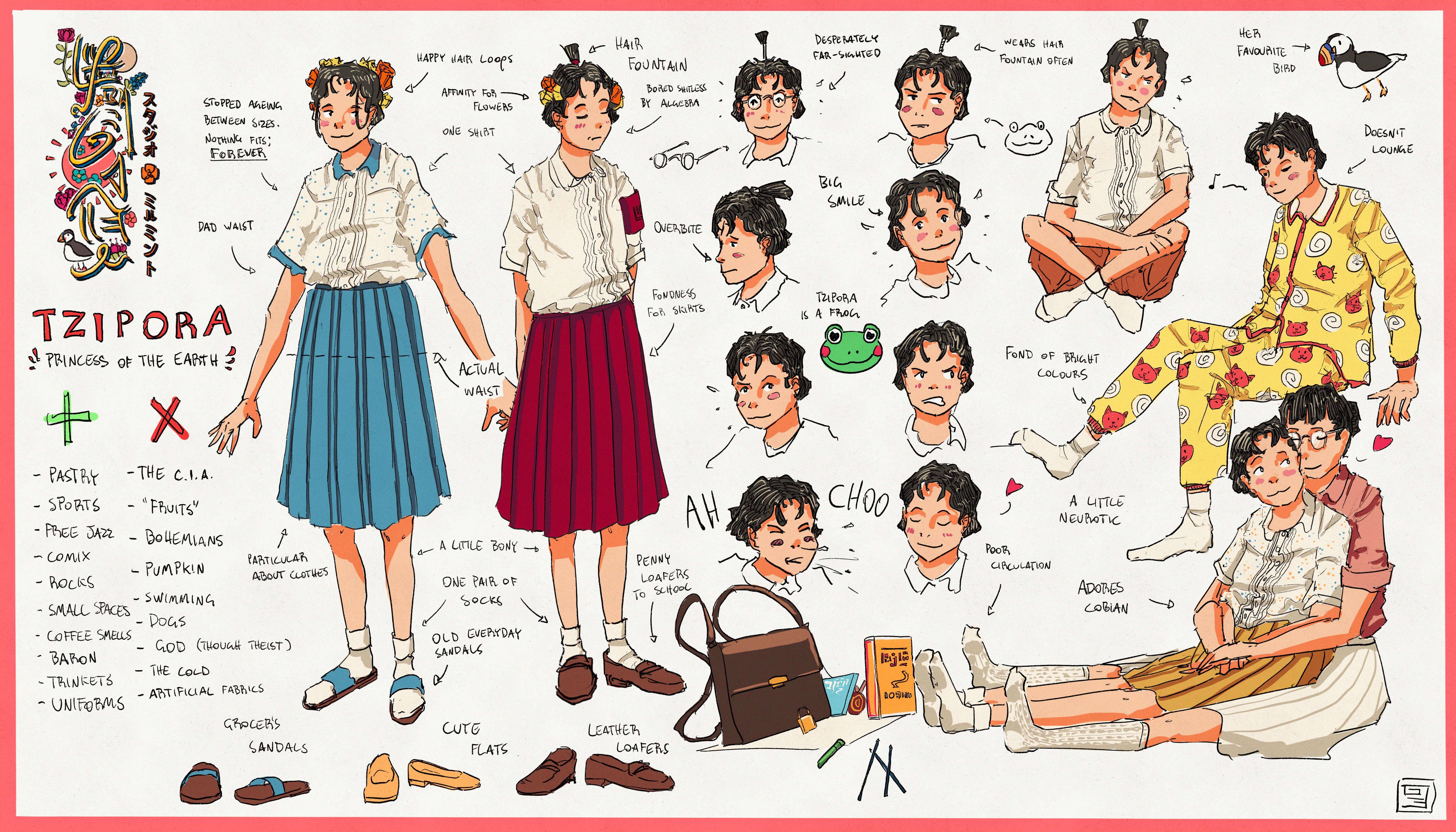 She has a lot of endearing characteristics that give great character to her mannerisms and physicality. She has a small overbite that makes her look a little froggy, and ritually pulls on her shirt and wipes her nose in anxious conversation. She is round-headed and cuts her hair herself. She talks in a low, expressive voice. She has been poorly socialised in childhood, and is afraid of casual conversation with people she does not know. She is keenly socially attuned and feels awkwardness painfully.