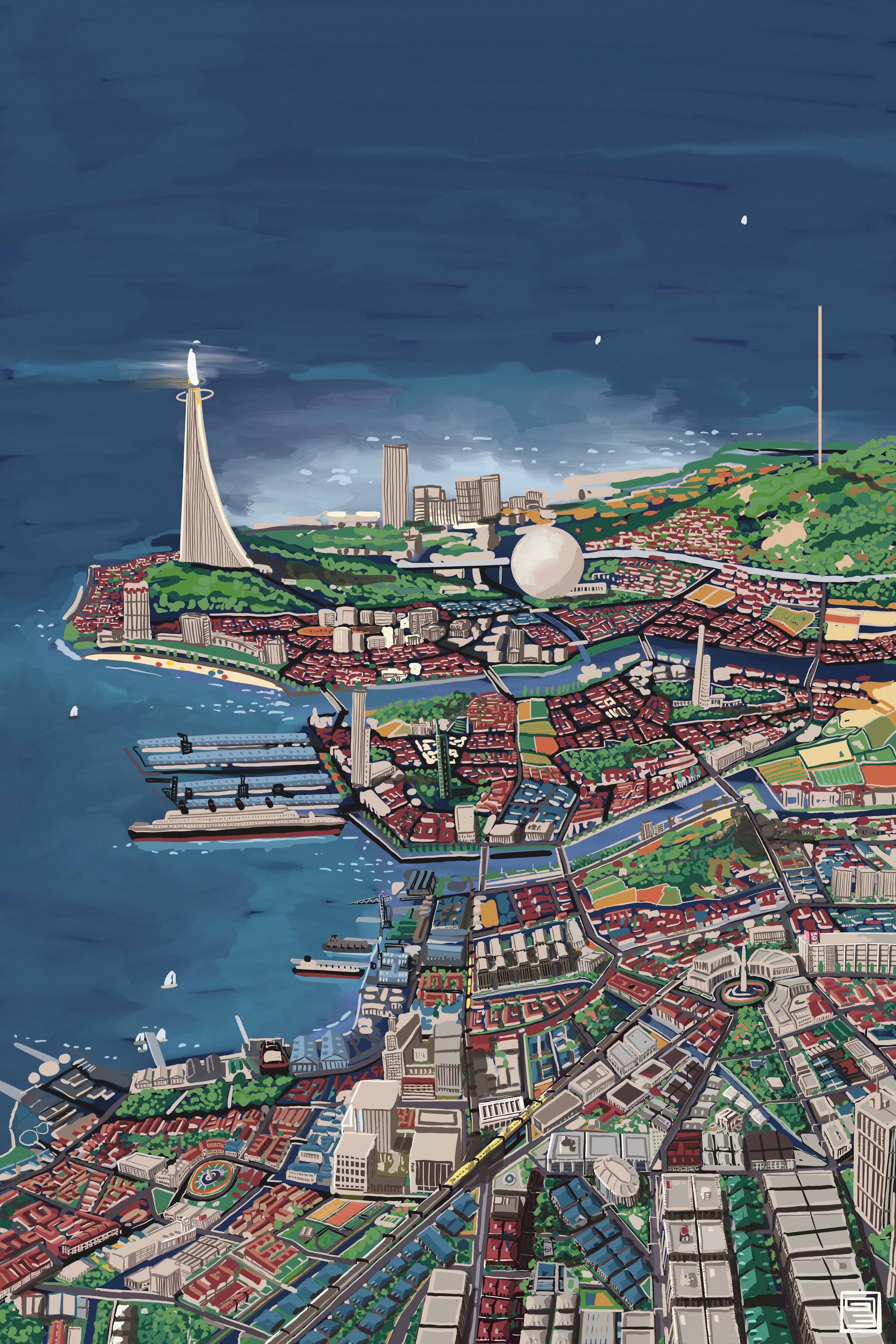 This image depicts the Vekllei city of Adouisneh, the florid culture capital of Vekllei’s Northwest. It is one of the “Five Crowning Cities” of Vekllei, measured by population and cultural significance, and was the site of one of the earliest parliaments in the world, centuries before the monarchy would come to power. You can see here the tension between old-world European planning and new-world Sundress Municipalism in the architecture and layout of this city.
