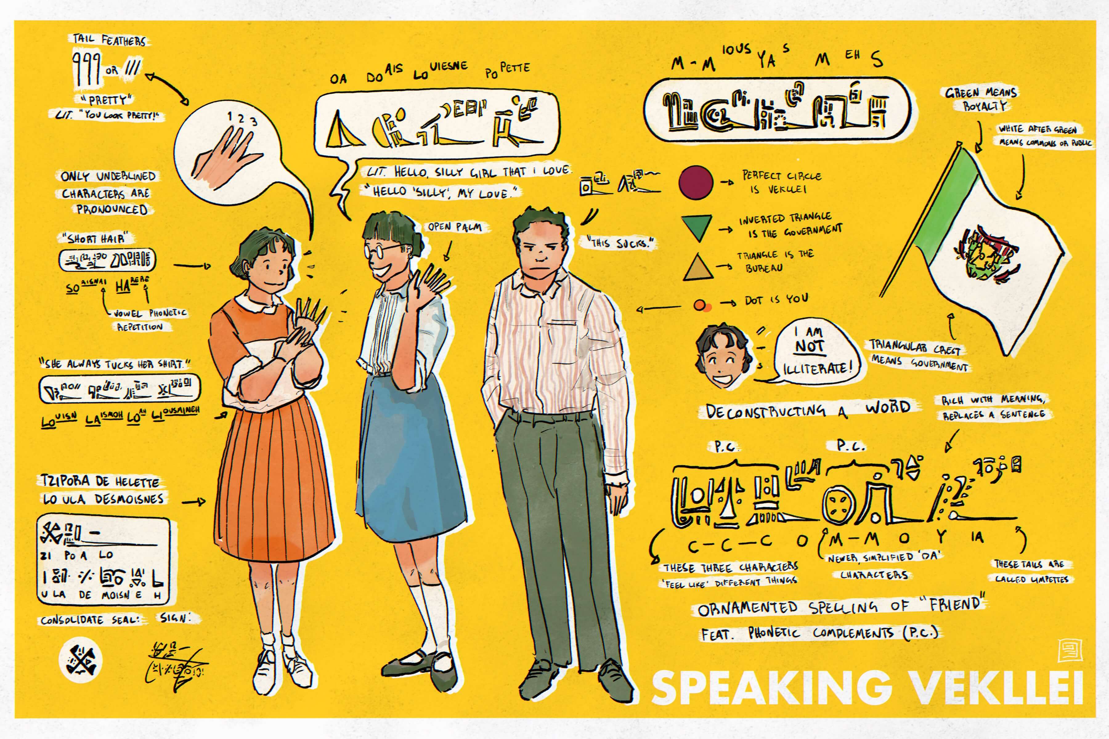 We can see various parts of the Vekllei sublanguages on display, including Topet, Rapotenne, Potenne and Vekllei Semaphore. Before Cobian gets close enough to say hello, Tzipora has already delivered a devastating compliment via a simple three-finger tap to the palm, admiring how she looks. A couple of descriptions of Tzipora written in Topet have been annotated on her left, to demonstrate its use, including a tongue-twister (“She always tucks her shirt” becomes “Louisn Laismoh Loah Liousmineh”). You’ll notice Topet looks especially hieroglyphic, even by pictographic standards.