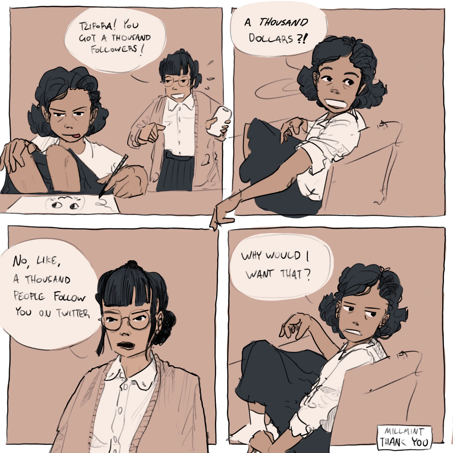 MillMint -millmint 📔 Intro 📓 Factbook 📕 MillMint 📗 Stories NEW 📗Story: Trash Scout ❌ 1,000 on X Sunday, Nov 26, 2023 Home Stories MillMint A little comic commemorating 1,000 followers on Twitter. 🔗Follow me by clicking here.