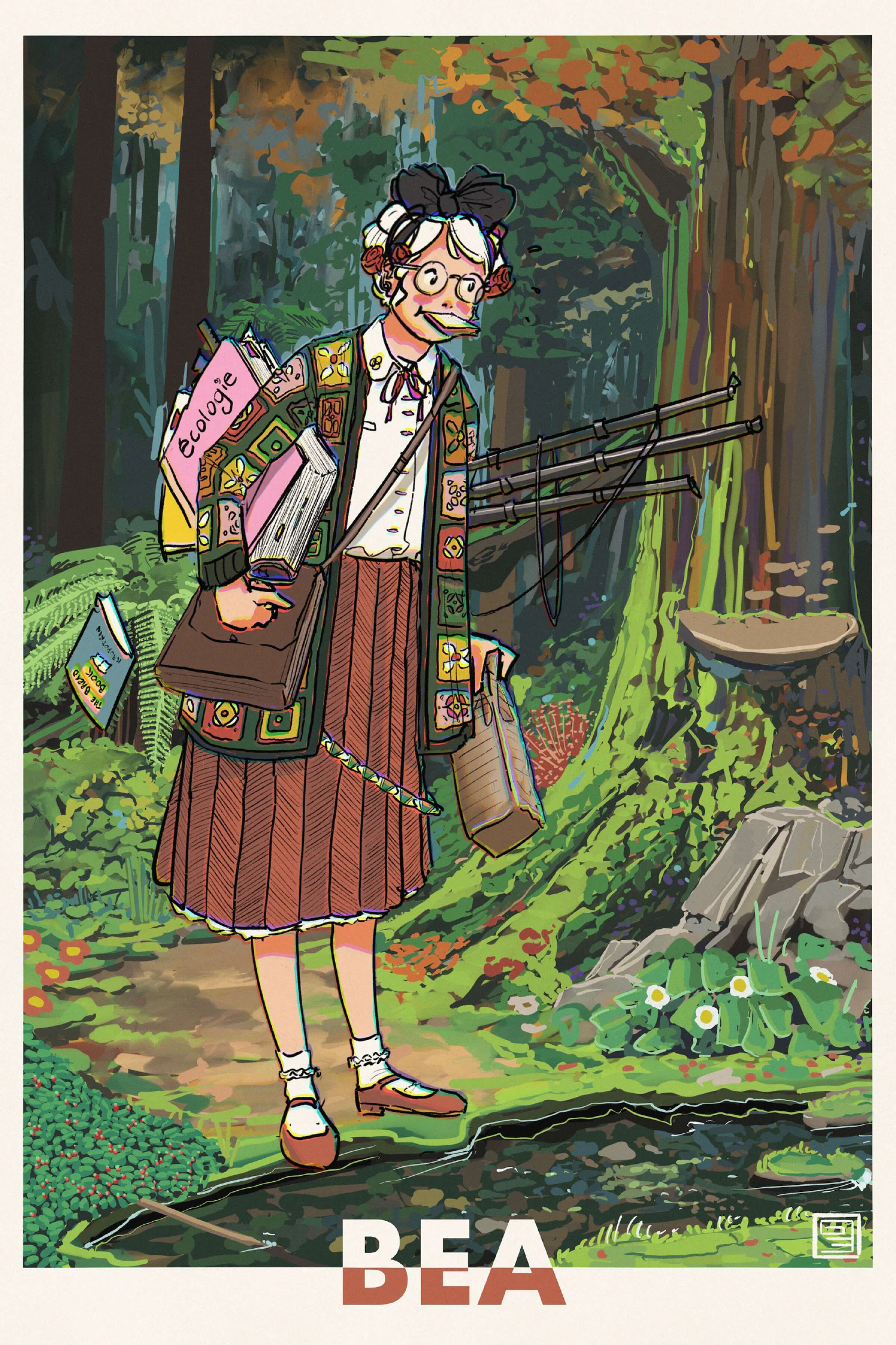 This is Bea, an energetic Botanist with the Landscape Bureau of Vekllei. People know her as an eccentric young woman easily persuaded by cottage-fashions, but she takes her work very seriously and spends most of her waking hours documenting the dense temperate rainforests of Veklleiโs coastal lowlands. These are not particularly adventurous expeditions โ most of her work is performed along old trails and paths, but Bea finds the sublime amidst the mundane and has contributed enormously to the ecological understanding of local flora in the borough of Holsyim, where she was born. She specialises in Bryology, the study of mosses and soft green bric-a-brac found abundant on Veklleiโs cool wet forest floors.