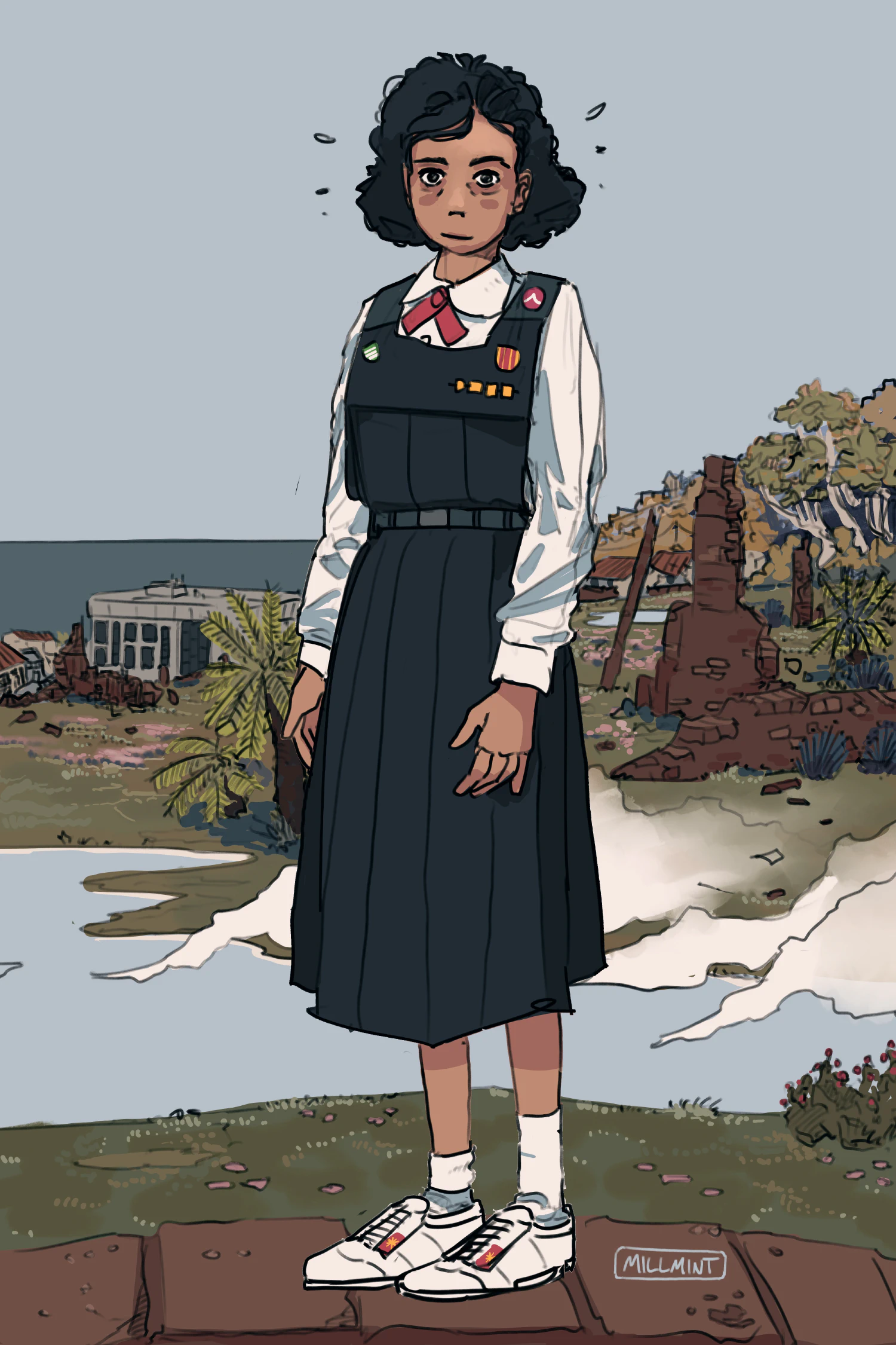 Above her neighbourhood in Seispri are the ruins from the Atomic War. Seventy years on, only brick chimneys, silent as cairns, survive the homes and people that once lived there.