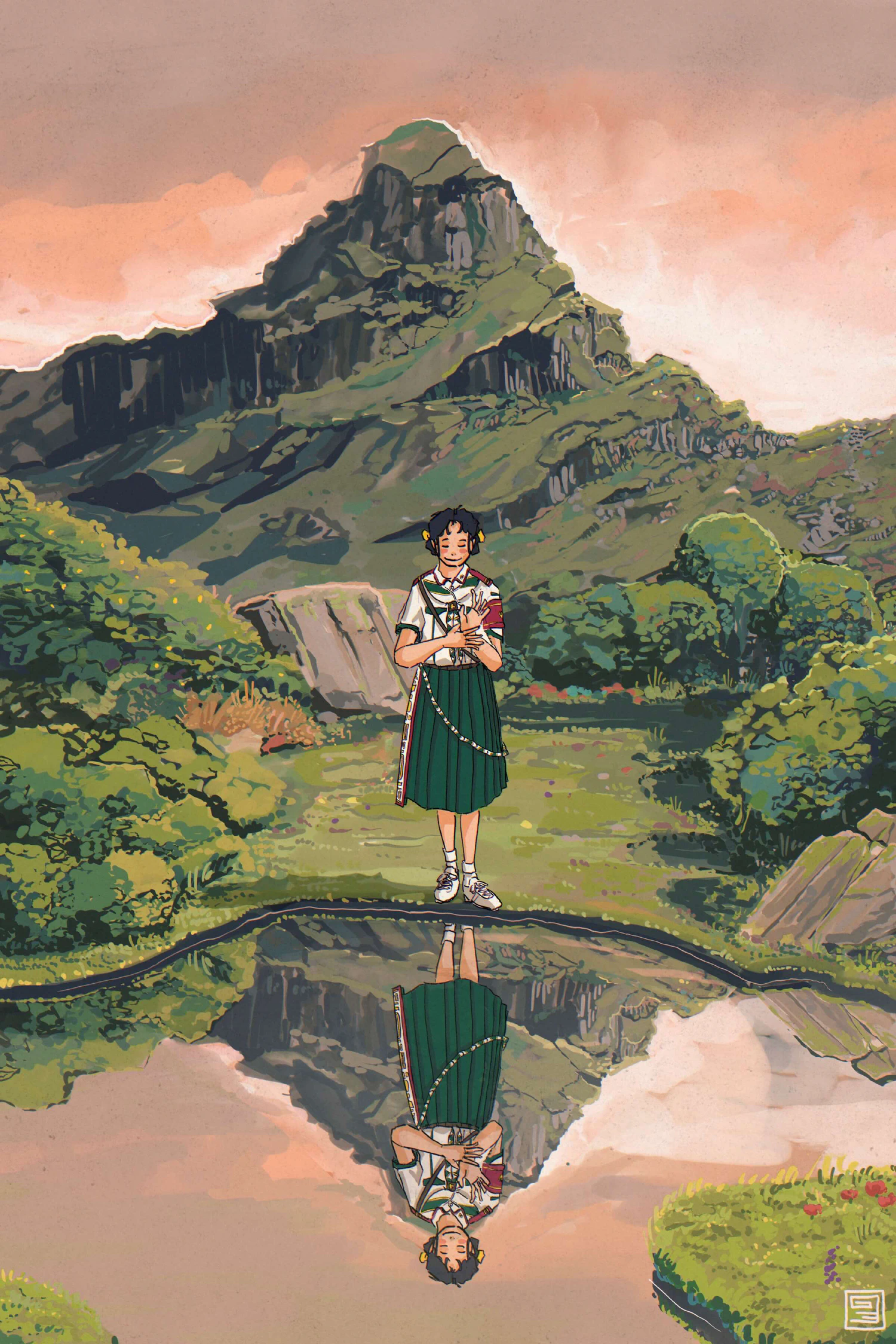 In this image, Tzipora meets her reflection with the Upotenne sign for peace and friendliness. Reflections of mirror-pools in Vekllei are believed to be places to meet spirits. While your reflection may not be a spirit, your reflection is closer to their world than your own, as a deconstruction of image and physicality. In this sense, Tzipora is hoping her gesture may carry through into the other worlds and convince them of human peacefulness. Such gestures are good manners, considering she is no longer in sovereign human territory and stands in the land of gods.