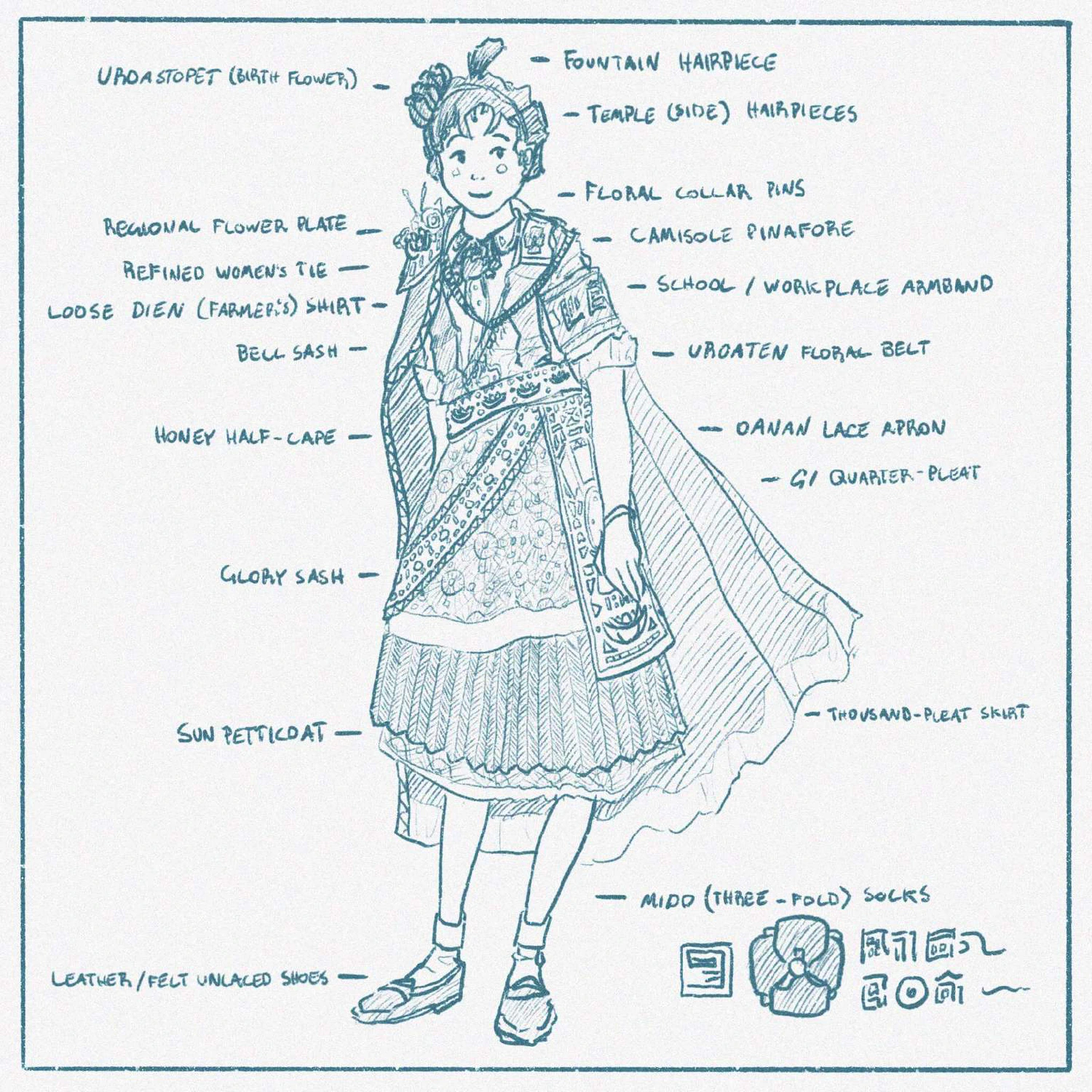 Vekllei is an ancient culture with many inherited and vestigial artefacts. Nowhere is this more apparent than in her national dress, particularly that for women, where old and new collide as they do all across Vekllei. Pre-war, post-war and future are present here. Letâs run through some of the elements, which can be found throughout her society.