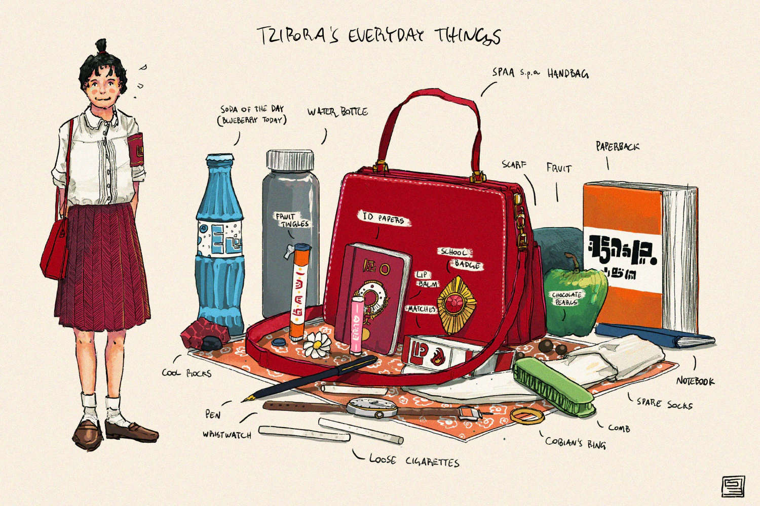 - Finally, there are a few accessories sitting in the bag. Tzipora made a ring for Cobian in metalworking class, but Cobian is on a school trip to France at the moment and Tzipora is waiting for her return. She has a wristwatch given to her by Baron, which she wears sometimes depending on the occasion. Other items are more precautionary — a scarf for the wind, a handkerchief for sneezing, and a spare pair of socks for when she visits Cobian’s house or if she needs to double up in cold weather. As summer turns to autumn, she also carries gloves and a beanie.