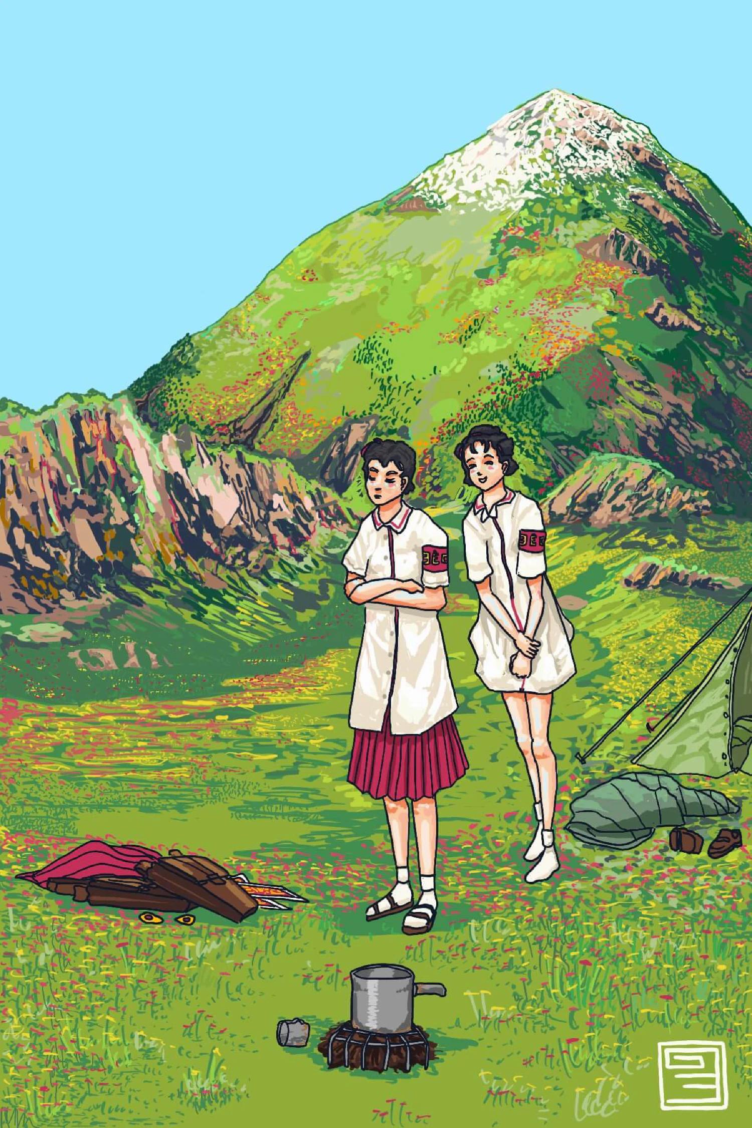 The two girls caught a train from school to the terminus, and then a rural line as far as it would take them out of the city. They had walked the granite shoulder of a mountain range for most of the afternoon, carrying only a few mouthfuls of provisions between them. They were both dressed in winter uniforms for the summer hike. The sea air gathered cold and malevolence as it escaped up the range of peaks that chased Vekllei Proper. The girls walked as far as they could with a view of the city abreast before mounting the peak and descending into the flowery plateau beyond the city centre. The path gave way to basalt drumlins and soft flower-tundra. The horizon was marked by volcanic imperfections, and framed a stretch of colour entirely untouched. For only a few hour’s ride from the city, and a handful of foodstuffs acquired from the small village the train terminated in, they had disembarked from civilisation entirely and entered the world of the spirits.