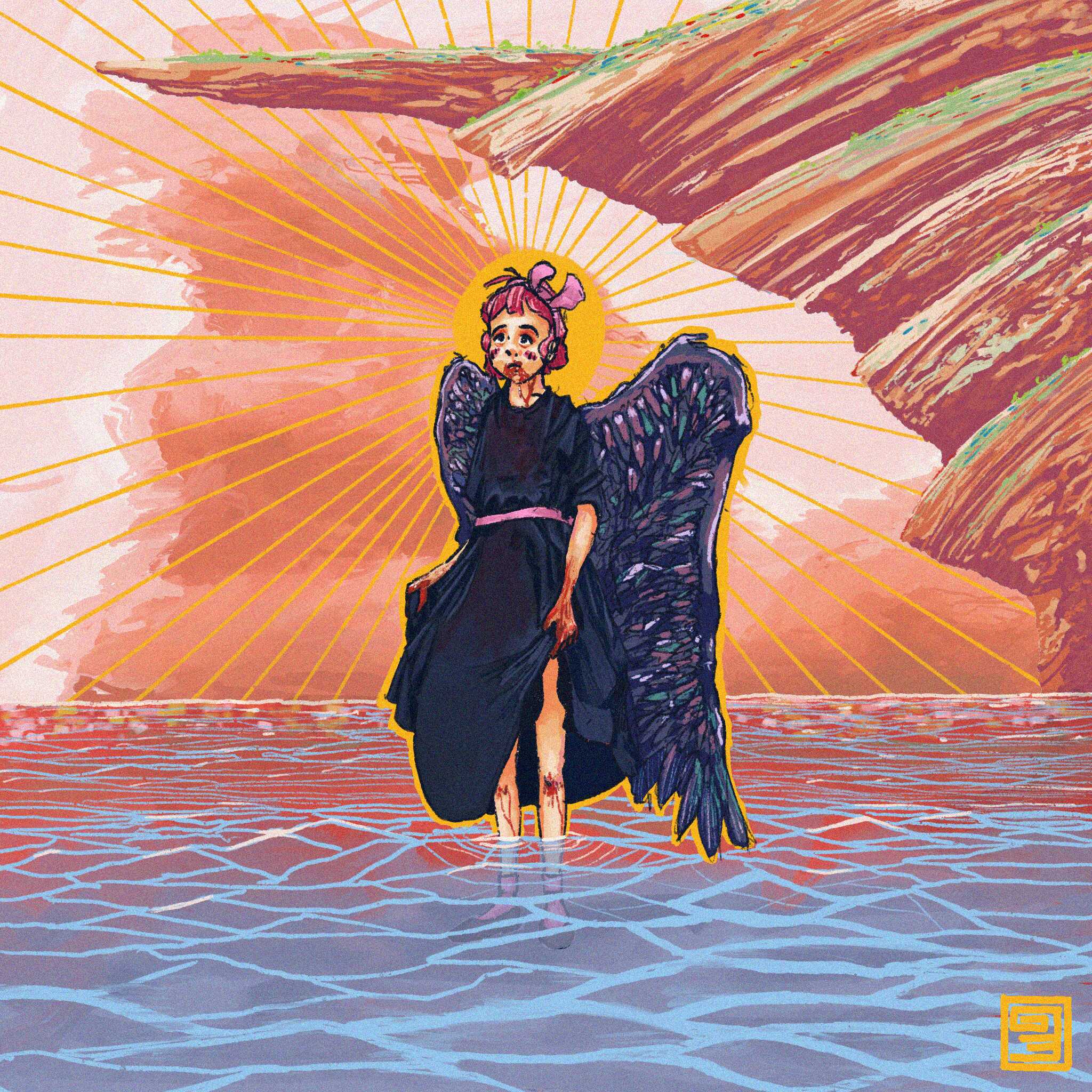 Uloah, pictured here, is one of the most recent goddesses to be tricked into committing bloodfit. She was unwittingly fed her own pet peacock, and ended up in the salt lakes of the in-between realm. Any god trying to eat for the first time is a messy affair. After a day of desperate tears and despair as she wandered aimlessly, she came across two beautiful goddesses about her age in Palace clothes. They took her to a village with homes made of long grass populated entirely by her kin. A life of pressures and treachery in the Palace was replaced with the simple pleasures of quiet agriculture and play.