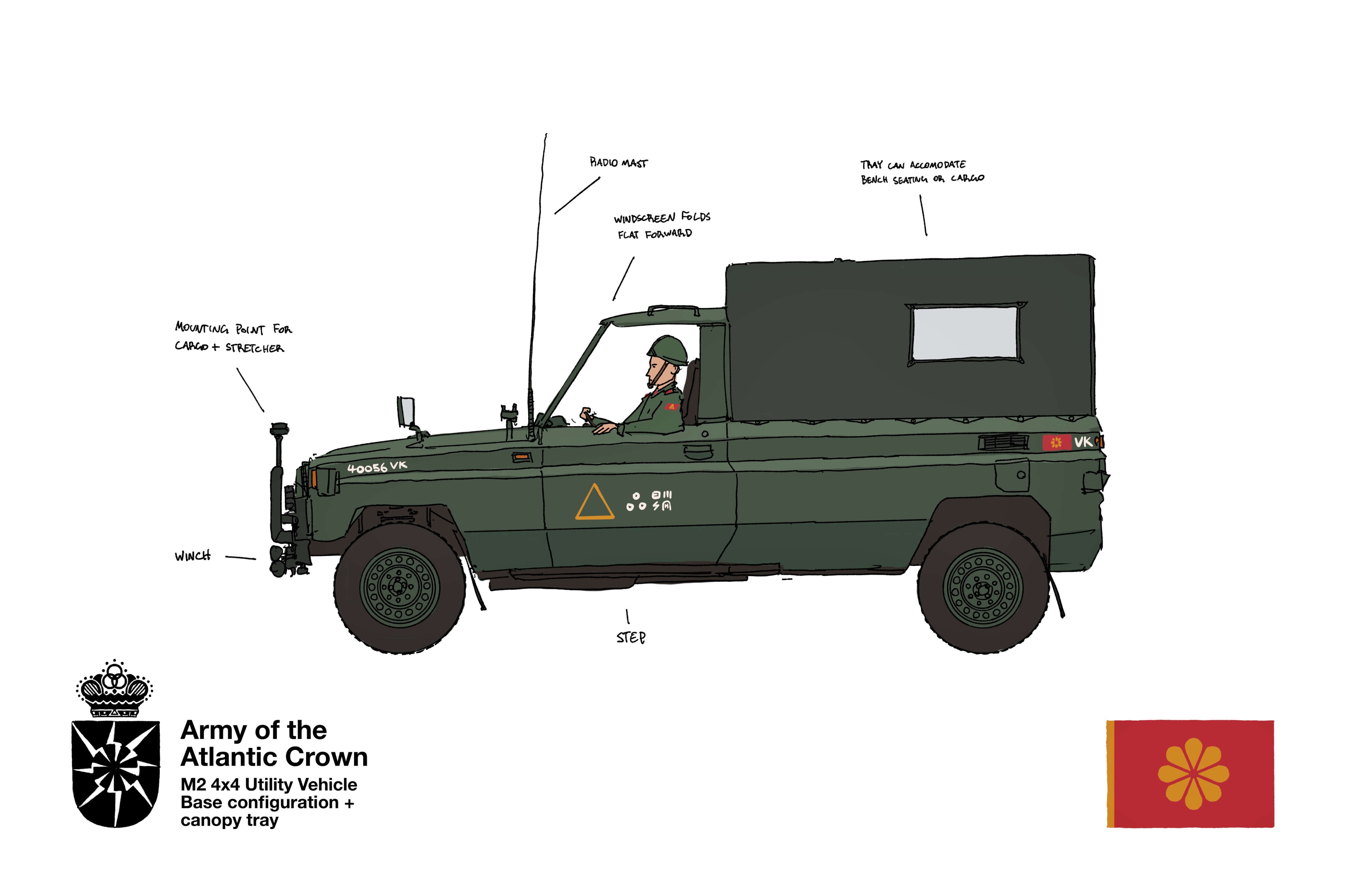 The M2 can be configured as an ambulance, troop carrier, power supply, fuel truck, gun platform, or for many dozens of other uses as required. To this end, it forms the basis of Vekllei’s flexible military logistics systems, and should be regarded as essential to the Vekllei Army as their rifles.