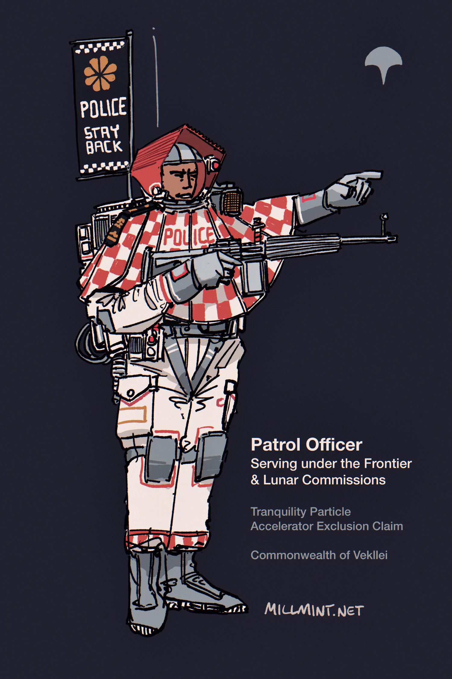 That flag serves a real purpose. The moon is a mess of overlapping claims and so “exclusion zones” make up the enforced, physical borders. Vekllei has a particle accelerator on the moon to create magnetic monopoles, so they patrol huge areas around it to keep people out. Monopolar particle accelerators have been sabotaged in the past (famously in Siberia in 2031) so they’ve got a total exclusion zone in place.