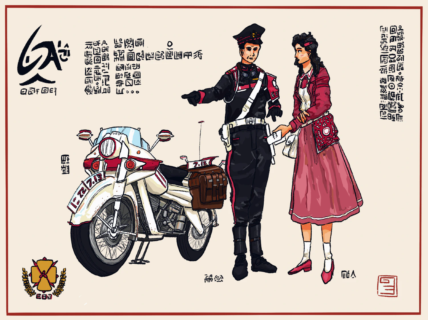 This woman here is an office lady, as designated by the small gi on her skirt. Sheβs late to lunch for a friend and only has an hour left. She hails the nearest constable, who helps her with directions. Such is the most extreme encounter most Vekllei people will ever experience with the elusive and romantic constabulary, at least until the second nuclear attack on the country and their rapid mobilisation as military police.