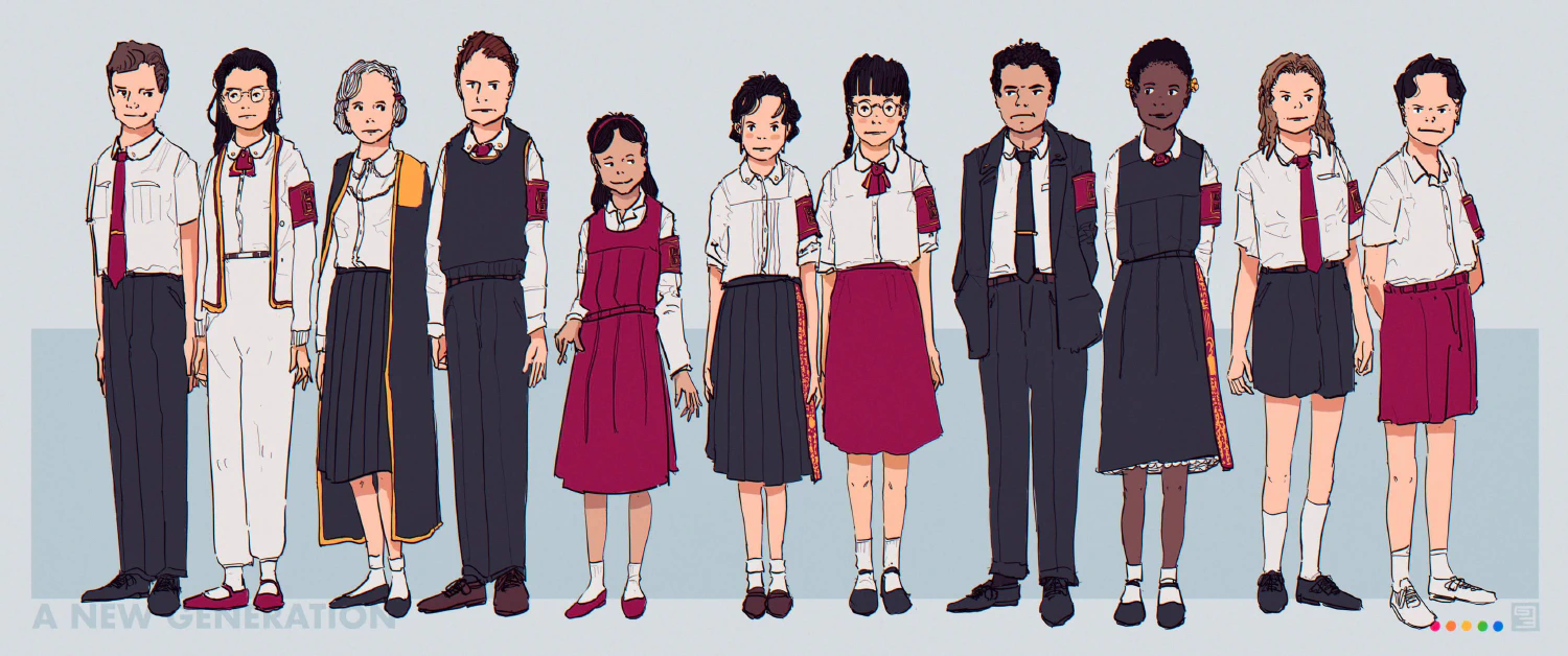 Discard any assumptions about the meaning behind the colour or style of their clothes — all variations depicted here can be worn by whomever, no matter their age, school or association. In fact, school uniforms are not provided directly by schools — they are found at department stores, on the rack alongside suits and dresses. Because of this fact, specific styles of shirt, trousers, socks and shoes vary between students — and are acceptable as long as they meet the basic requirements of the uniform. This intersection of control and anarchy can be found widely throughout broader Vekllei society, and is an interesting example of how the basic principles of the “Vekllei way of life” are reflected in the microscopic mundanities of life and foundations of national culture simultaneously.