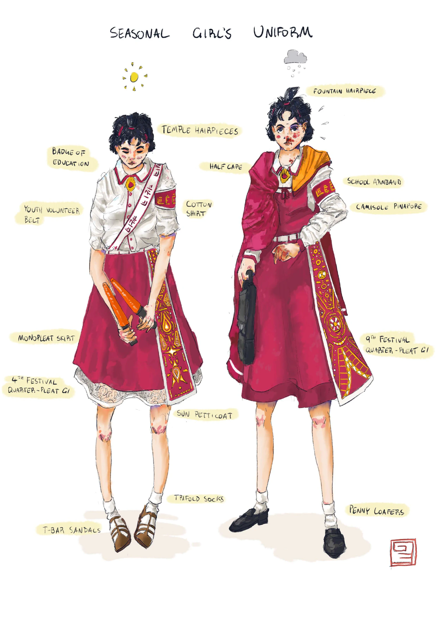 Year-round, all students wear a school armband with their year and class embroidered on it and a badge of education, which is pinned to the top button. Girls wear a selection of other traditional items.