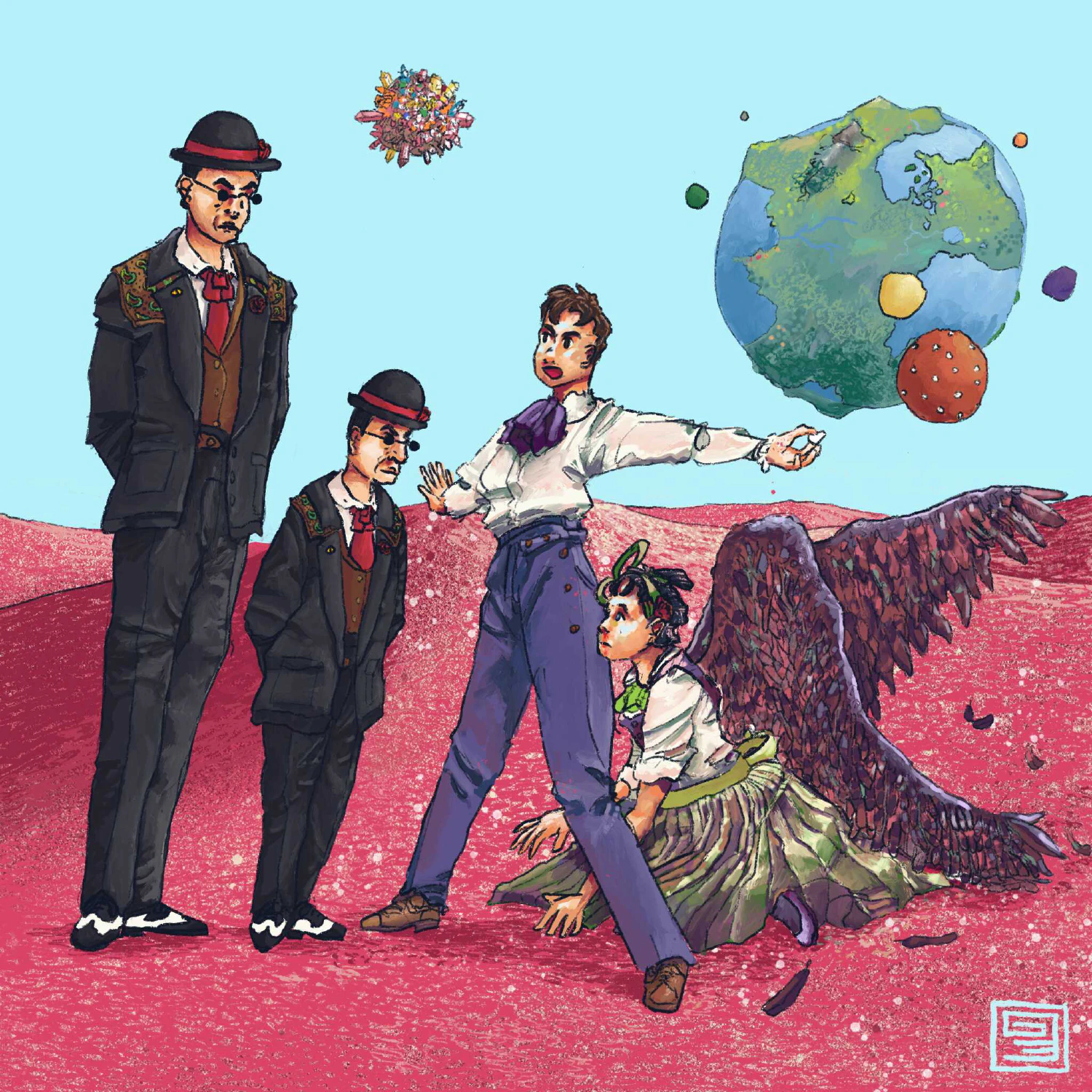 She could feel the wind rising. The horizon beyond was warped, caught in the distortion of a forested planetoid before them. The morning sun cast a honeyed warmth on her wings of black sugar, which sang like wind chimes as she soared high above the gem deserts below. Hyssop, her new and only friend, followed her ungracefully under the spell of his flystone.