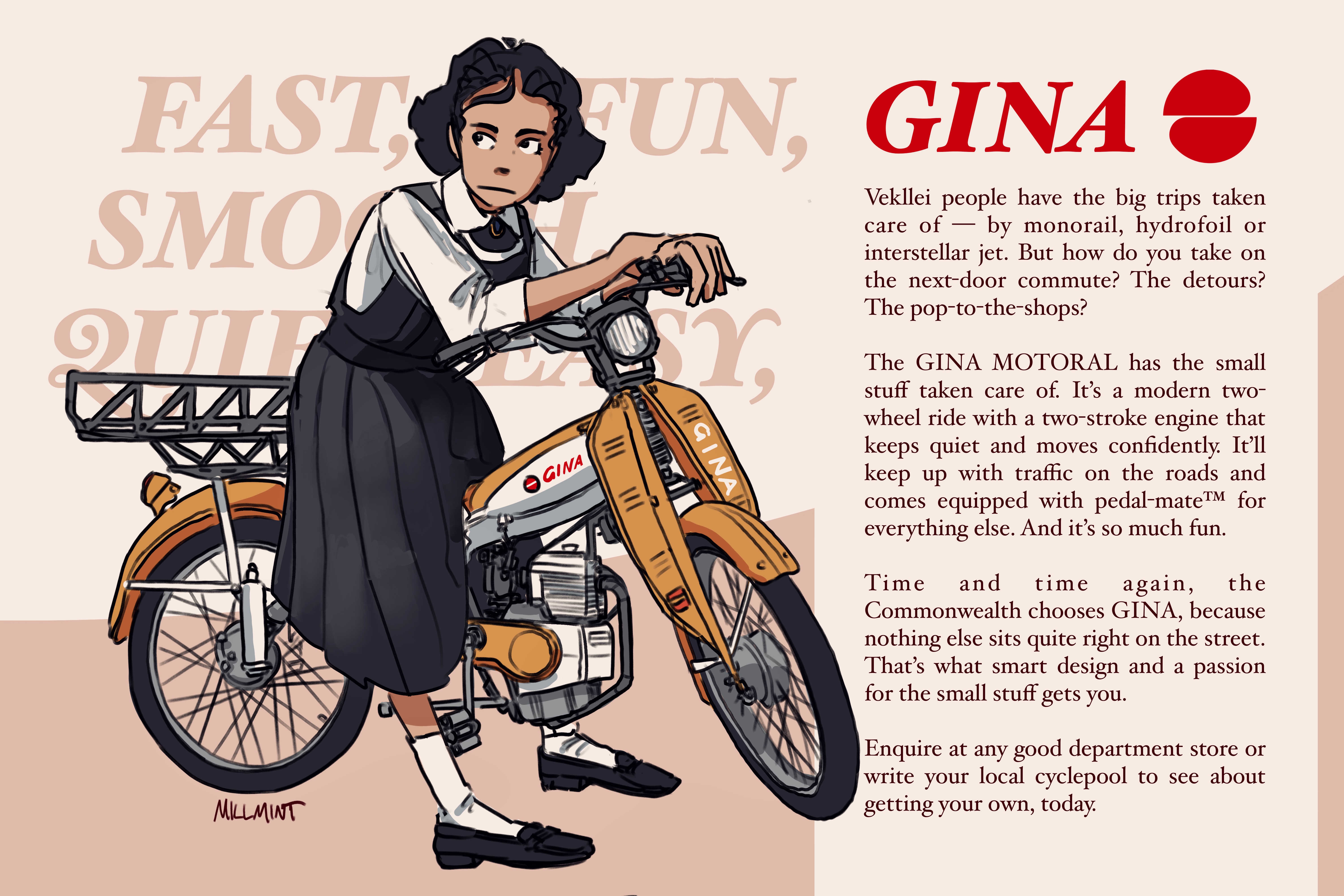 Gina is the most popular petrol-bike manufacturer in Vekllei. The family that still owns Gina are actually legendary bike racers themselves, and sponsor racing events. Vekllei people use bicycles for work and recreation, but aside from athletes there isn’t really a “bike culture” like we have in our own world.