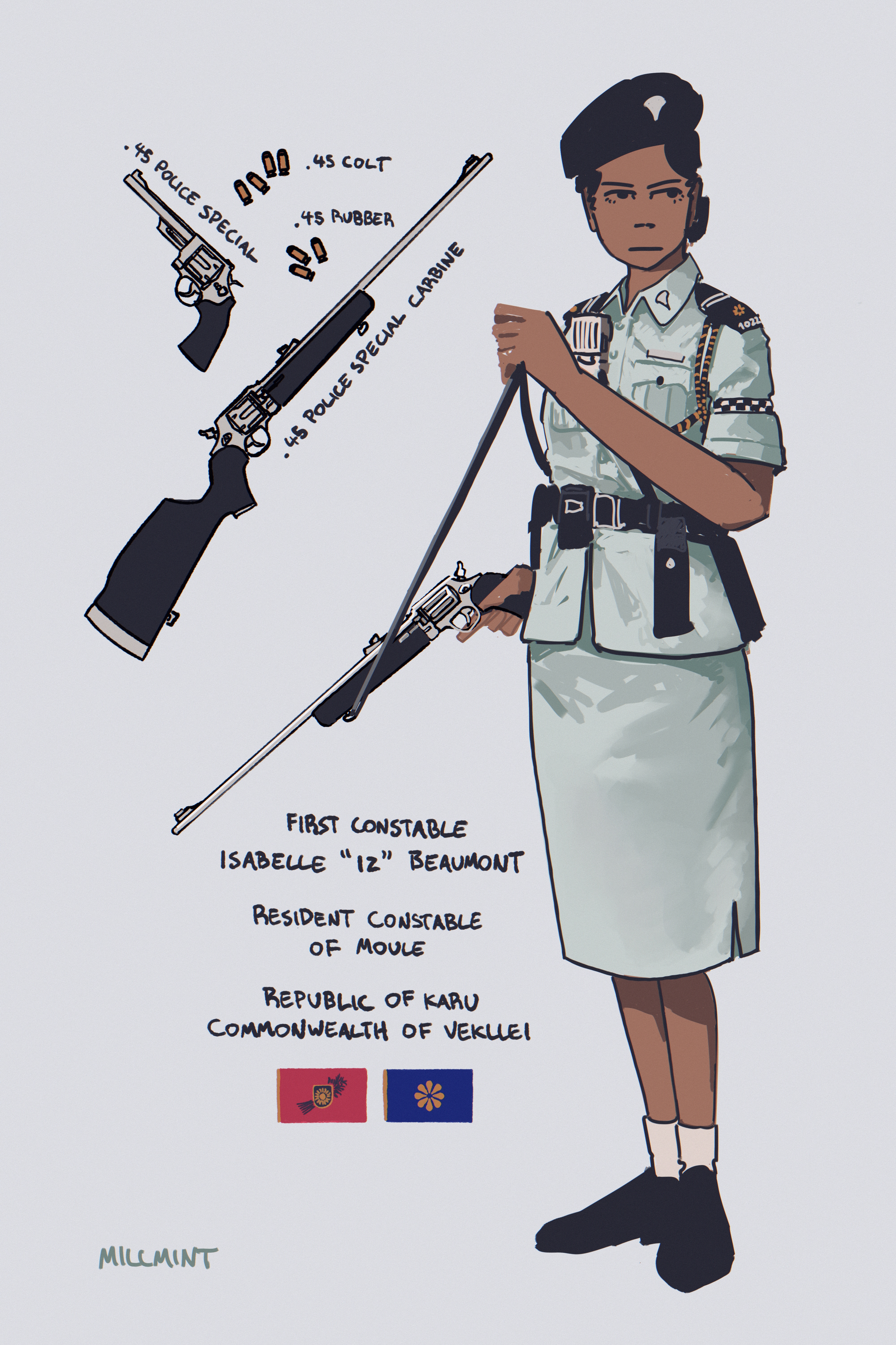 Policing in Vekllei is often unusual. They can carry sabres instead of batons, regularly patrol sand banks and are armed with special revolver rifles chambered in the same .45 colt as their service weapon