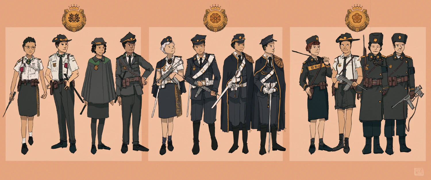 Vekllei has three police forces, one for each of its features as a country. These are the Police of the Public, Parliament, and Crown, reflecting the people, state and sovereign of Vekllei respectively. The diagram attached depicts seasonal variants of male and female uniforms, as well as some of their equipment.