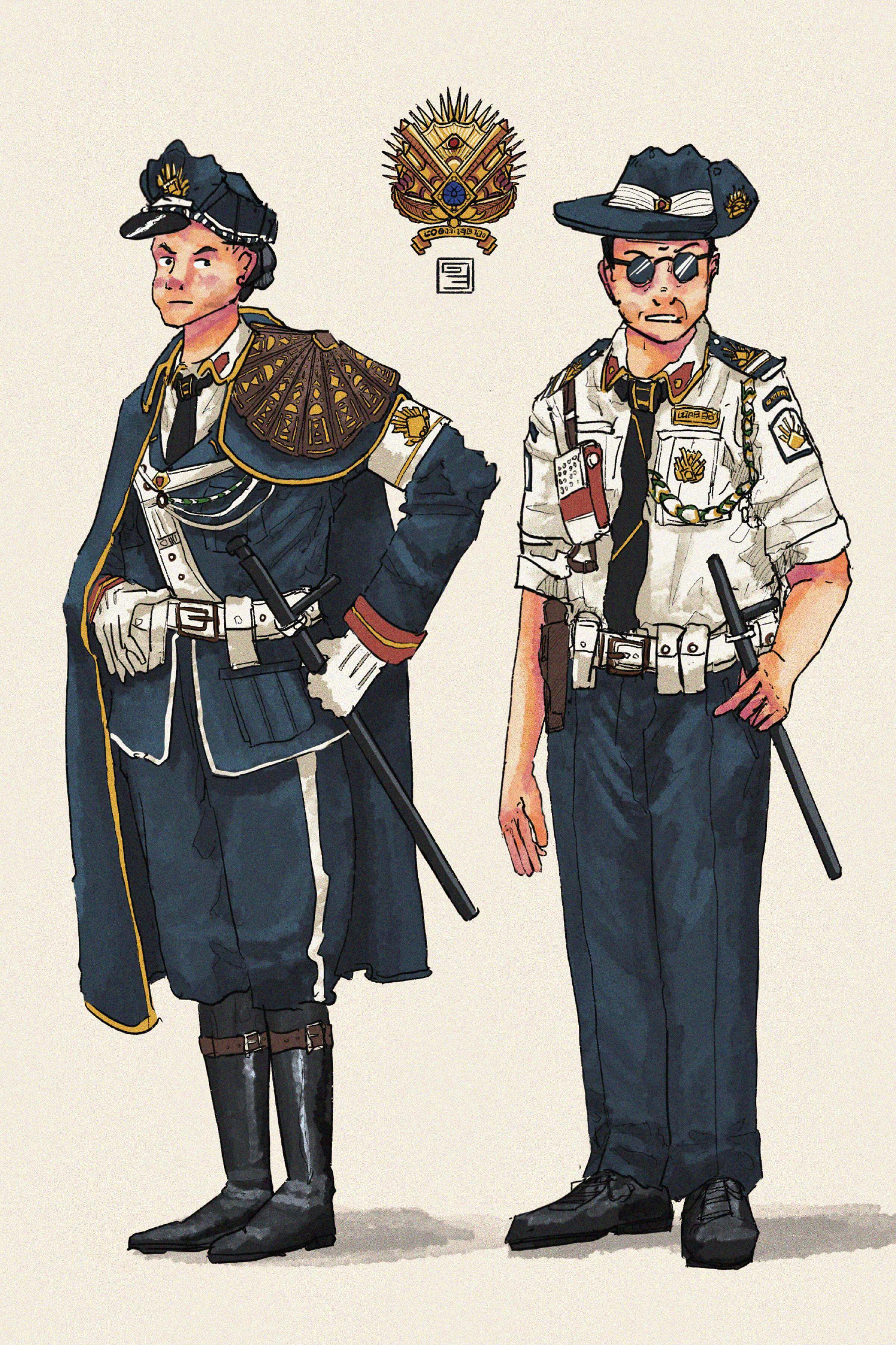 This is contrast to the cosmopor, a more conventional police outfit. A cosmopor officer stands on the right, in standard summer uniform. He carries a radio, revolver and rubber baton for the worst of his duties, and is embedded deep into his local community. Cosmopor officers traditionally visit and introduce themselves to each house in their beat, and spend far more of their time mediating, counselling and organising than they do making arrests. The autonomy of most Vekllei communities largely spurns petty legal proceedings, and so the cosmopor are a critical aspect of sundress municipalism, resolving disputes personally and taking custody of a person only when it’s needed. Most crime in Vekllei tends to be emotionally motivated — so it is in this domain that cosmopor navigate.