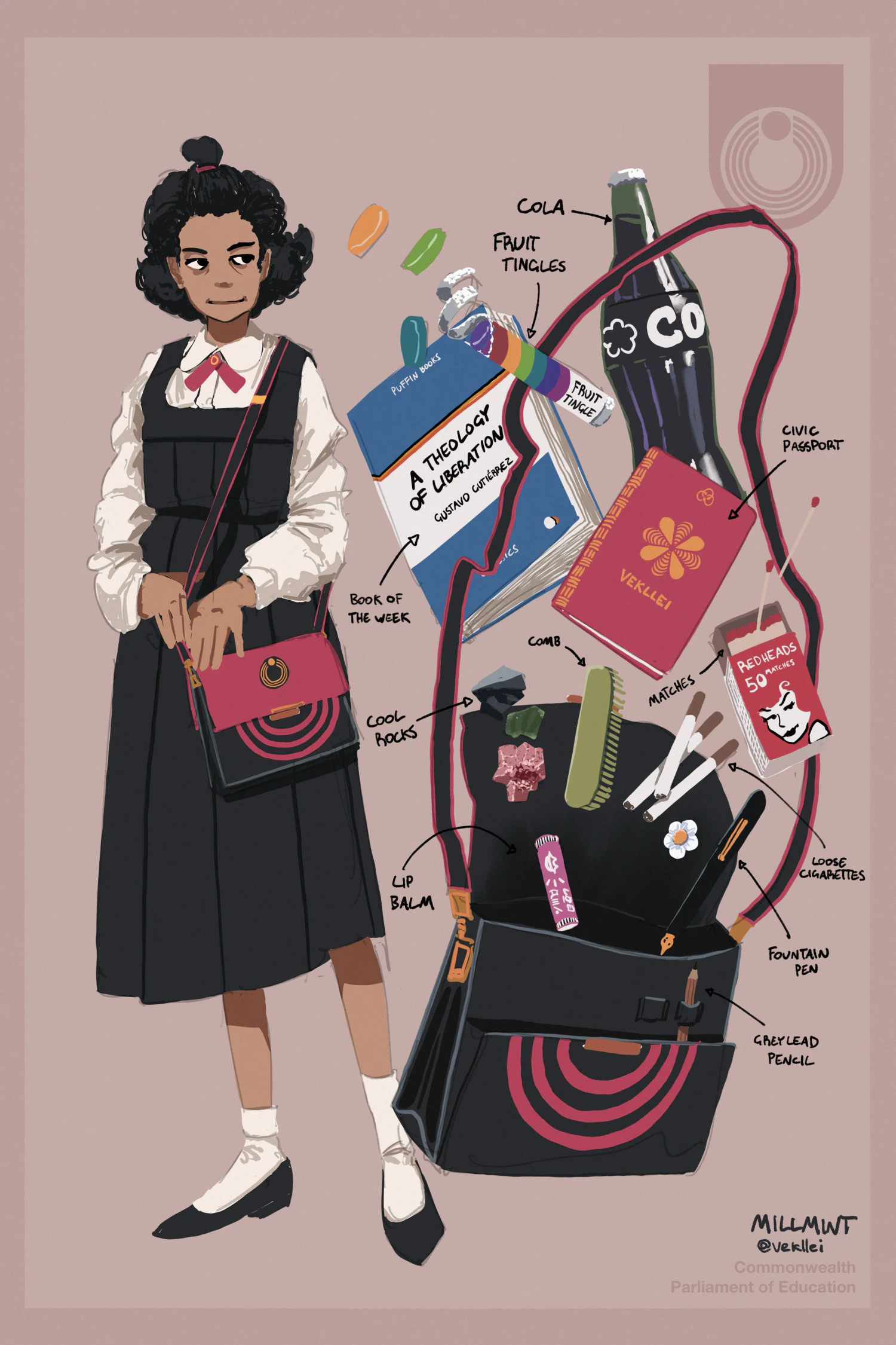 Perhaps most visible in Vekllei society is the “company purse,” a quirk of this culture in which almost all employment with a major company awards a branded purse, designed in the colours or imagery of the employer. Vekllei government also gifts “company purses,” as do government schools by extension.