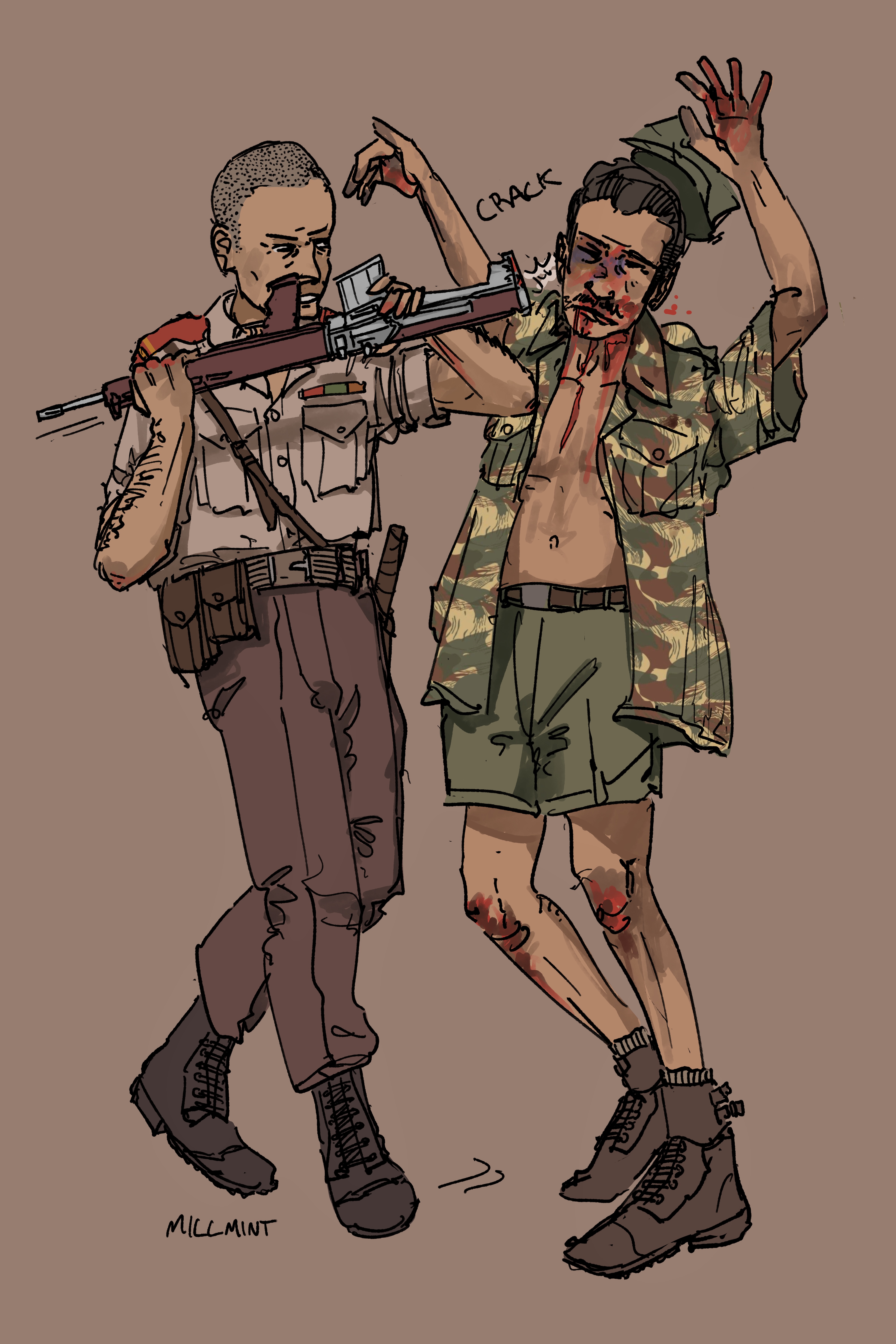 The Korean man who lead 4th Patrol of the volunteer battalion had a reputation for violence. On Friday they watched a half dozen corpses float downstream, their bellies surfacing like porpoises. He took his boys up to Simon Town and found six Rhodies. They shot and buried six Rhodies.