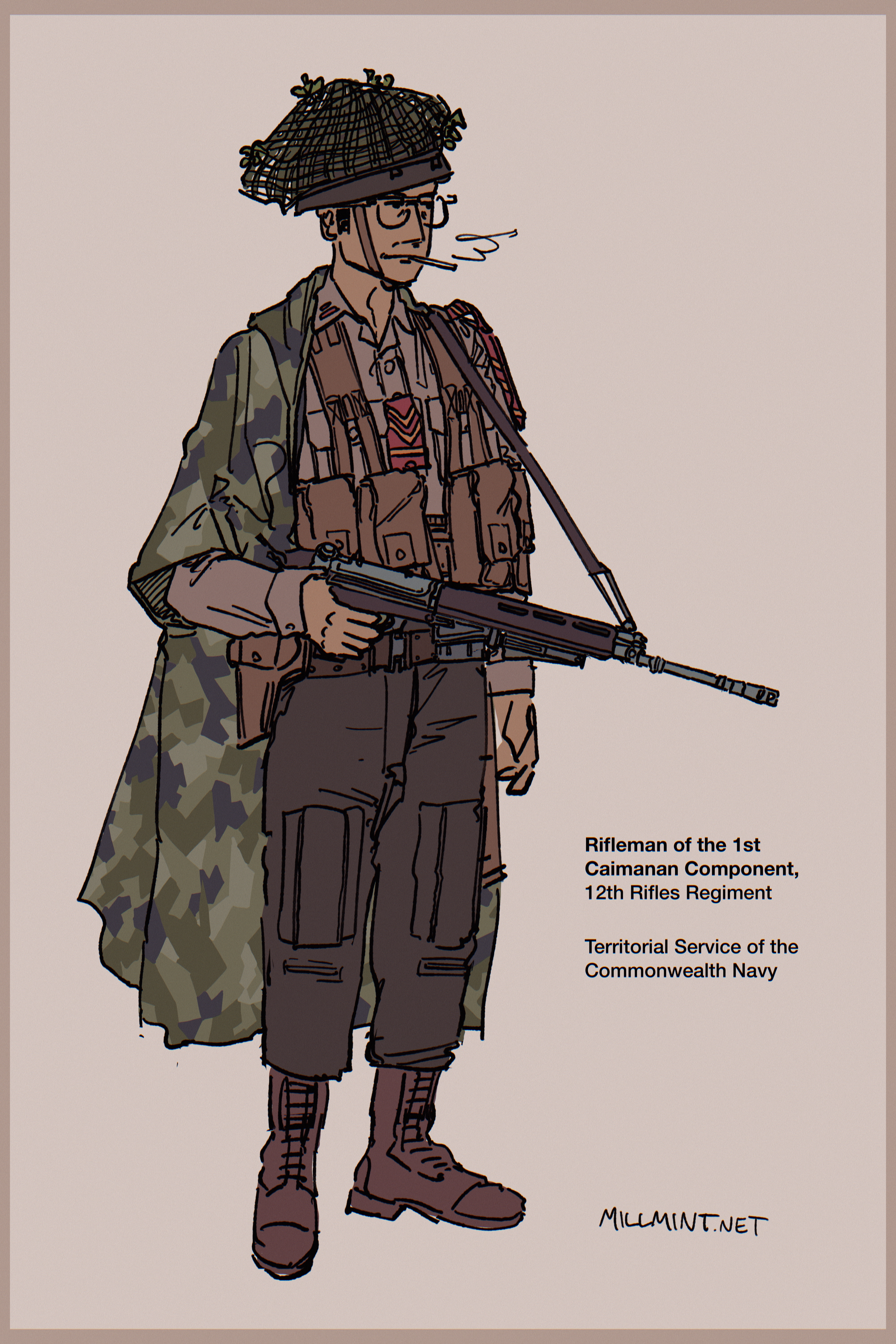 MillMint -millmint 📔 Intro 📓 Factbook 📕 MillMint 📗 Stories NEW 📗Story: Trash Scout ❌ Rifleman Sunday, Oct 27, 2024 Home Stories MillMint Rifleman of the [[territorial|Territorial Services]], feat. [[Vekllei]] camo poncho & mitznefet.