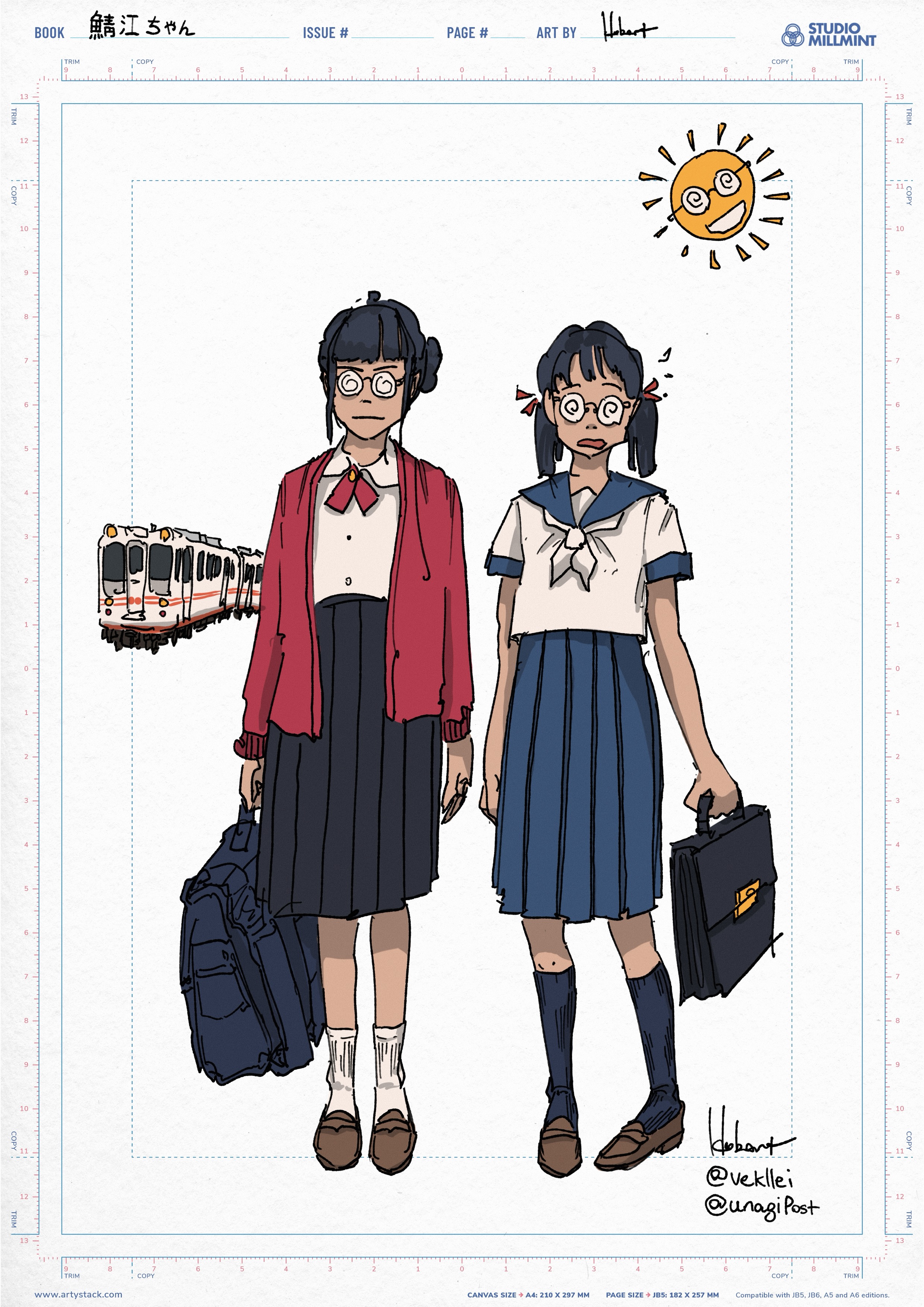This character belongs to a Japanese artist and train enthusiast I follow on Twitter. Something about her appearance and oversized glasses were really funny to me, so I decided to draw her. This must have been out of left field for him, since I’d never interacted with him before, but he really liked it!
