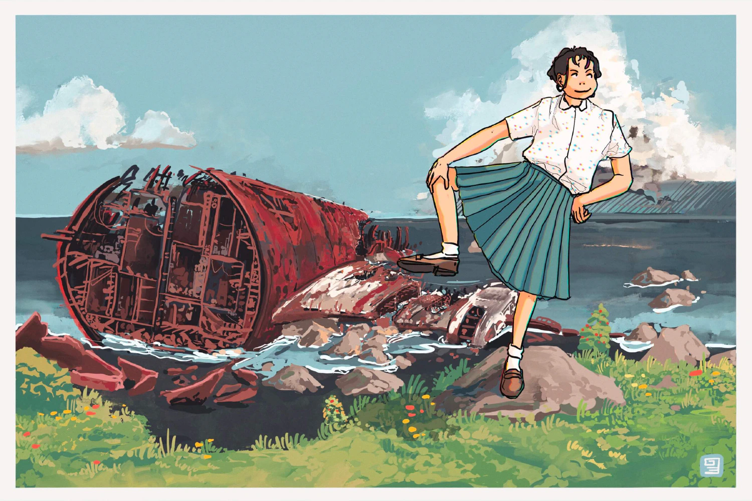 In Eyri, the bones of an ancient beast warp and groan in the sun, red skin glinting in the whitecap churn of the shallows, oxidising, broken, ripped open by the sea. Everyone in the North of Vekllei knows about it. Mysteries abound. Even in our atomic century, the humans of Vekllei are enamoured with and terrified by the ocean.