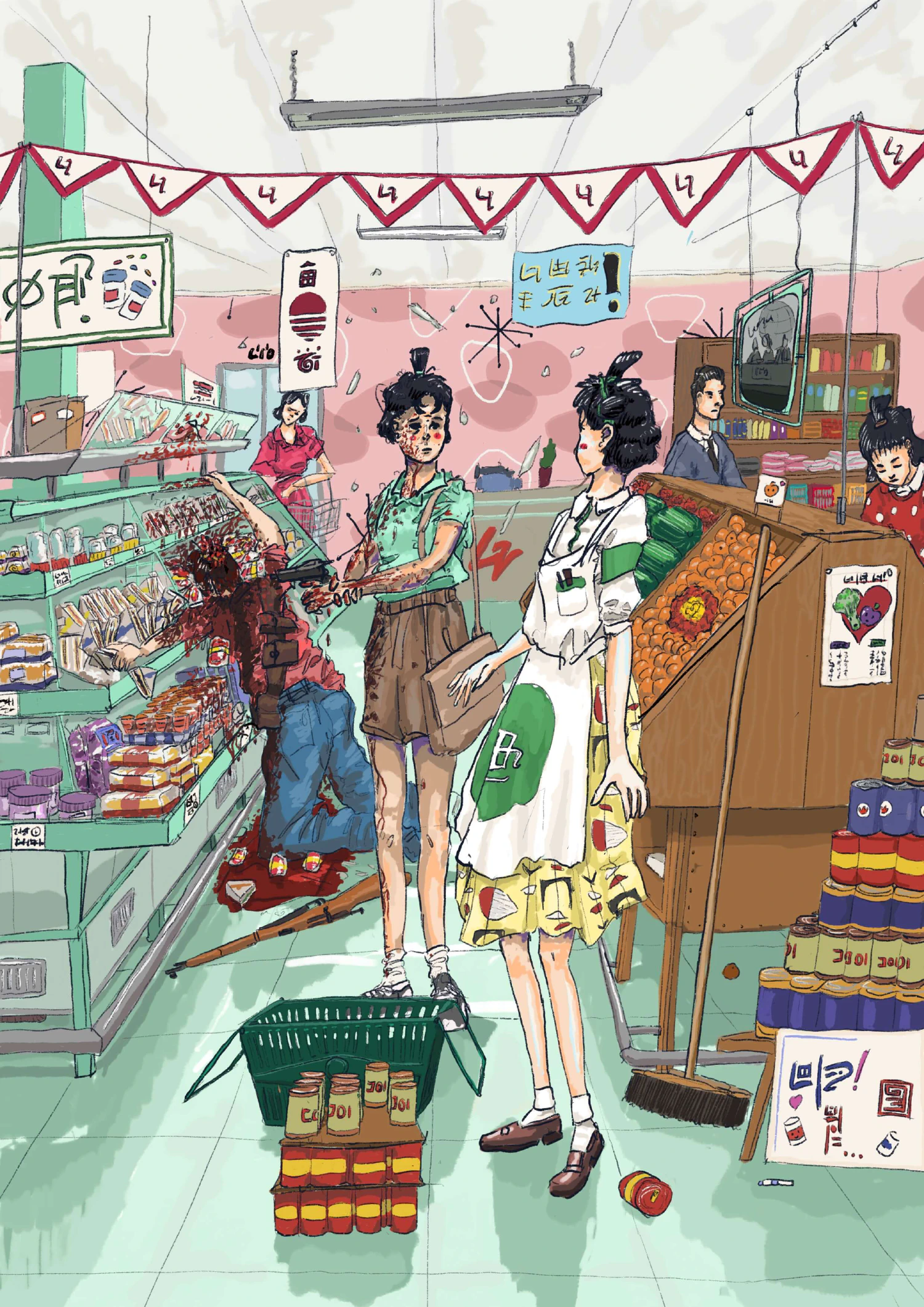 A fluorescent light burst on Thursday. She was stacking cans for a display. The girl was working alone that evening and leaving her mark everywhere ā happy apple drawings, new posters, displays ā she liked the job.