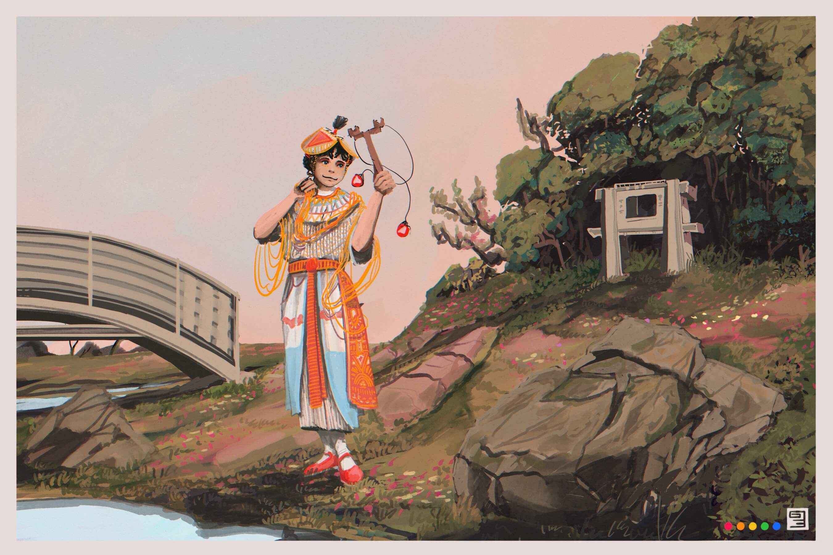 In ritual dress, you are supposed to only communicate via Upotenne, which is the physical language of runes. Itโs a form of sign language that incorporates the whole body, and is understood by most Vekllei spirits. Tzipora does not know Upotenne very well, so only says a few words before waving her ball-stick around. With any luck, theyโll shower her with blessings โ or at the very least, not cause her harm next time she intrudes on them.