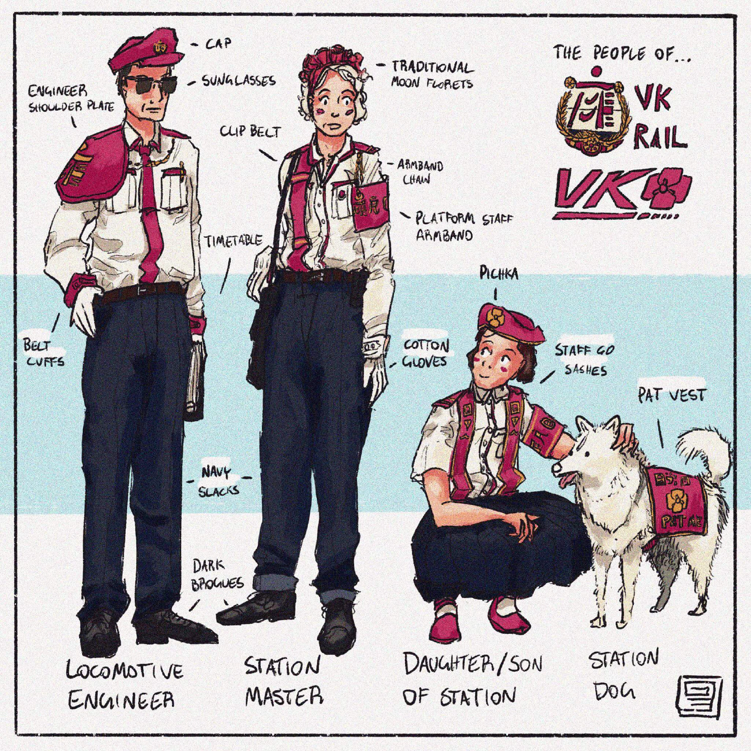 The first, the locomotive engineer, drives a train in four hour shifts. They wear a shoulder plate to distinguish them from other miscellaneous station staff and carry a pedigree in Vekllei culture, as a country dependent almost entirely on rail internally.