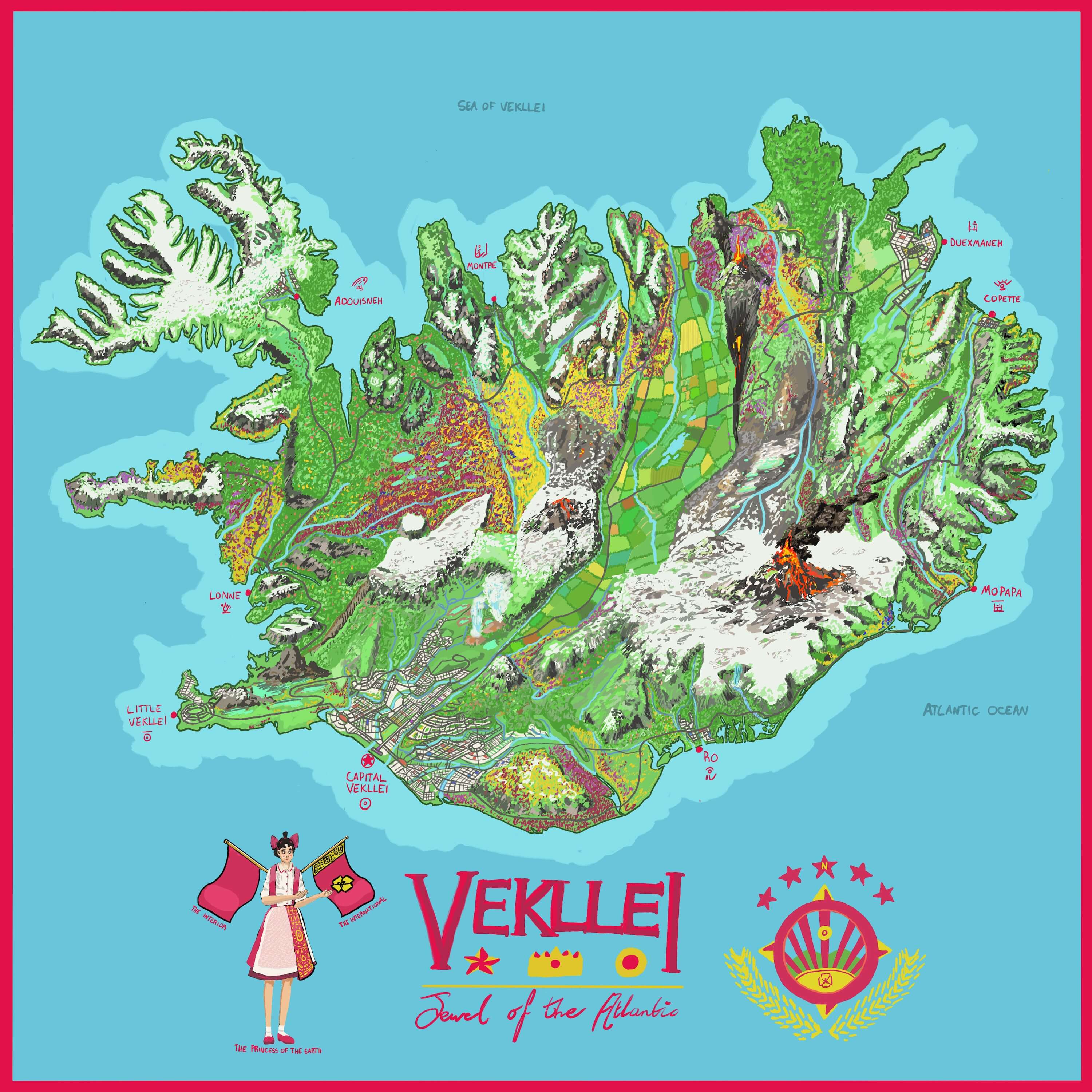 On this map, which is cartoonish and exaggerated, you can see several landmarks — Vekllei’s largest volcano (Durtoneis, or Fire of the Earth), the expansive lava fields to the North, and Vekllei’s food basket, which runs between the ro highlands and the fault line. Only Vekllei’s massive glaciers, which give the country the cleanest drinking water in the world, are in permafrost.