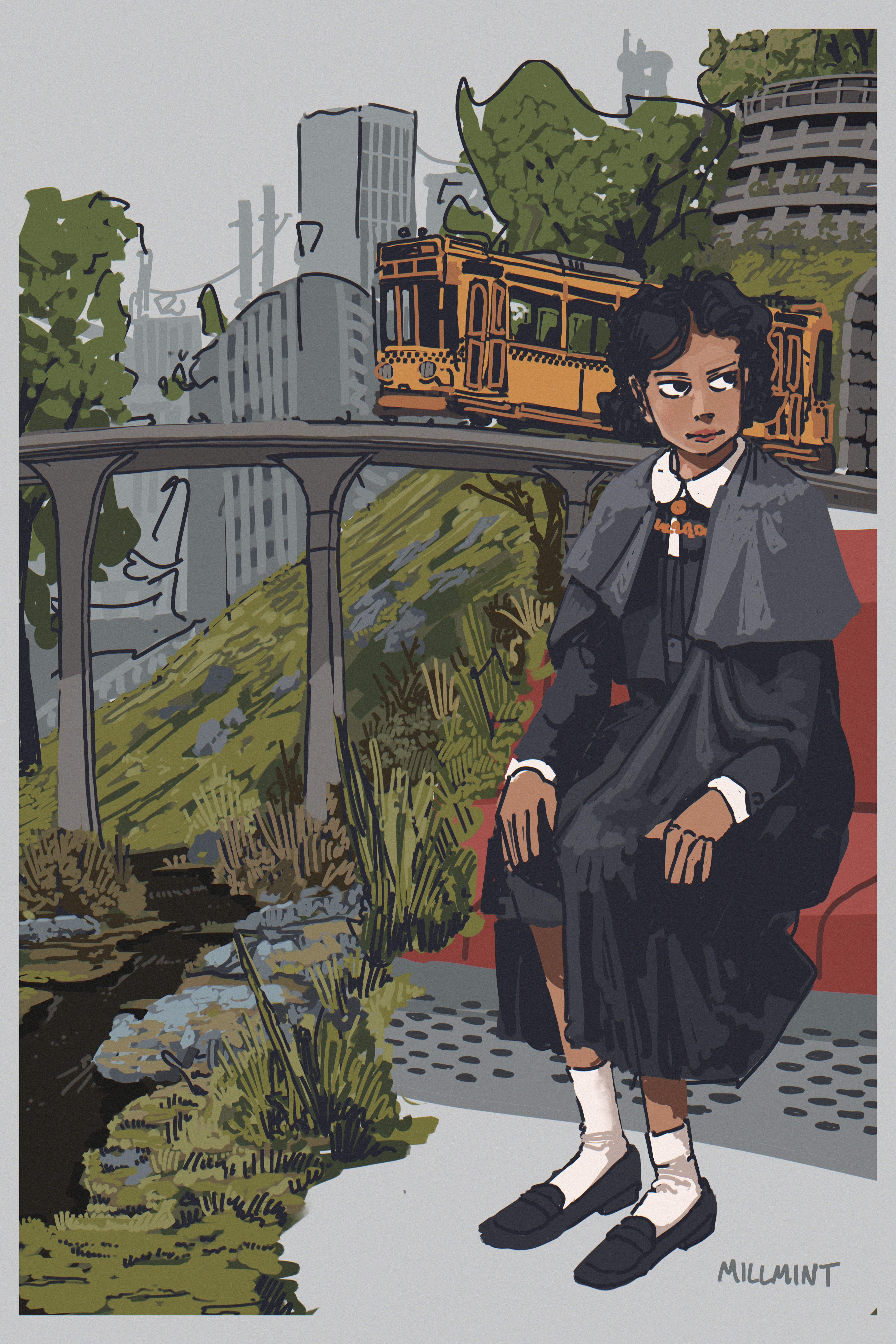 MillMint -millmint 📔 Intro 📓 Factbook 📕 MillMint 📗 Stories NEW 📗Story: Trash Scout ❌ Tram Ride Tuesday, Mar 4, 2025 Home Stories MillMint Vekllei operates special school trams on busy routes. Tzipora is wearing an cape because it cools off in the north atlantic autumn.
