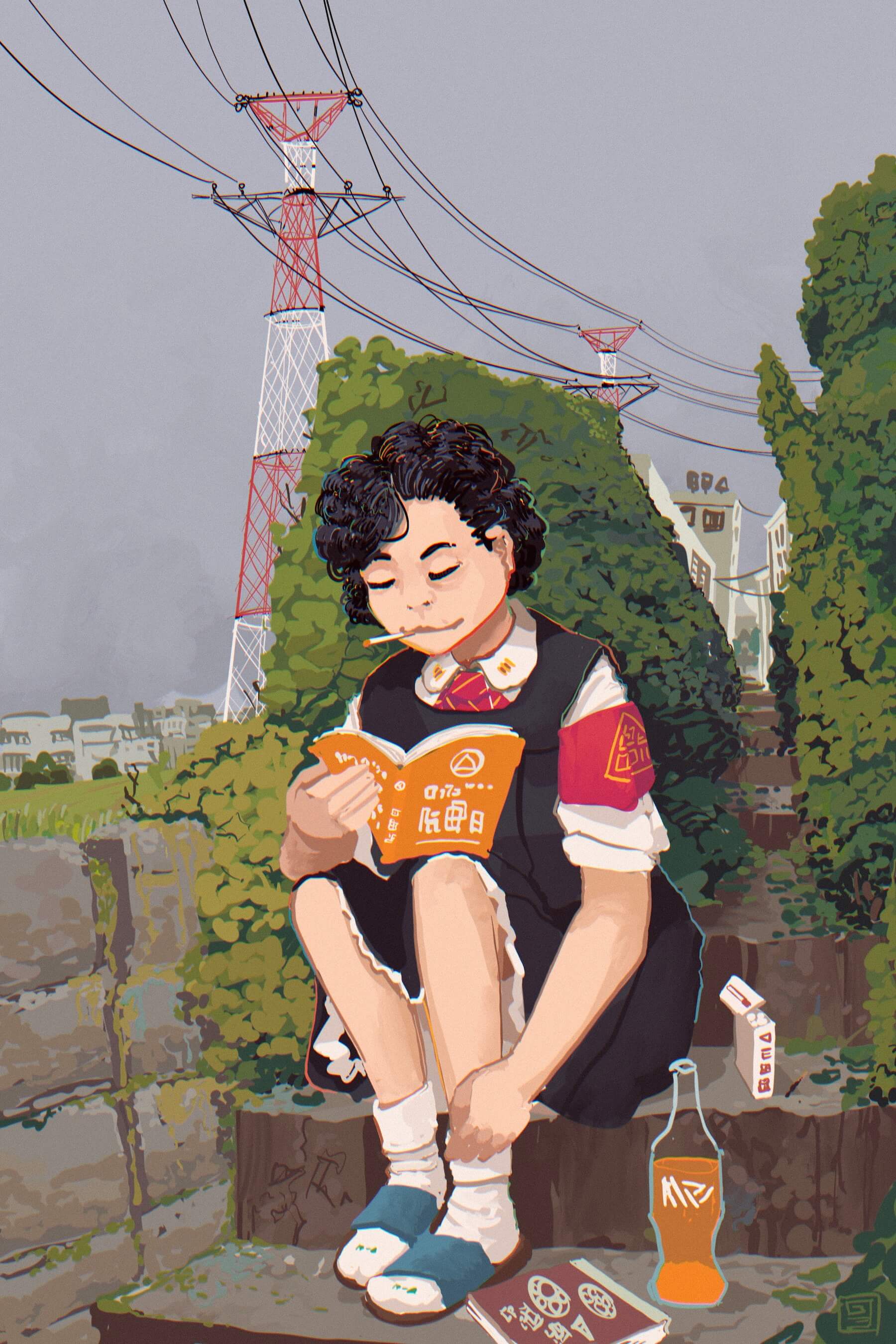 Depending on what she was making for dinner, she would usually head back out sometime around three thirty and find somewhere to read in her neighbourhood. From all places in Seispri you could see its beautiful circular high-voltage transmission towers, which carried power from the 2nd Magma-Electric Cogeneration Plant to their homes, supplying them with heat and light. The neighbourhood had been bombed in the war and there were still ruins out here. You could find old paths that were abandoned, overrun with mosses and bushes. These were good places to read.