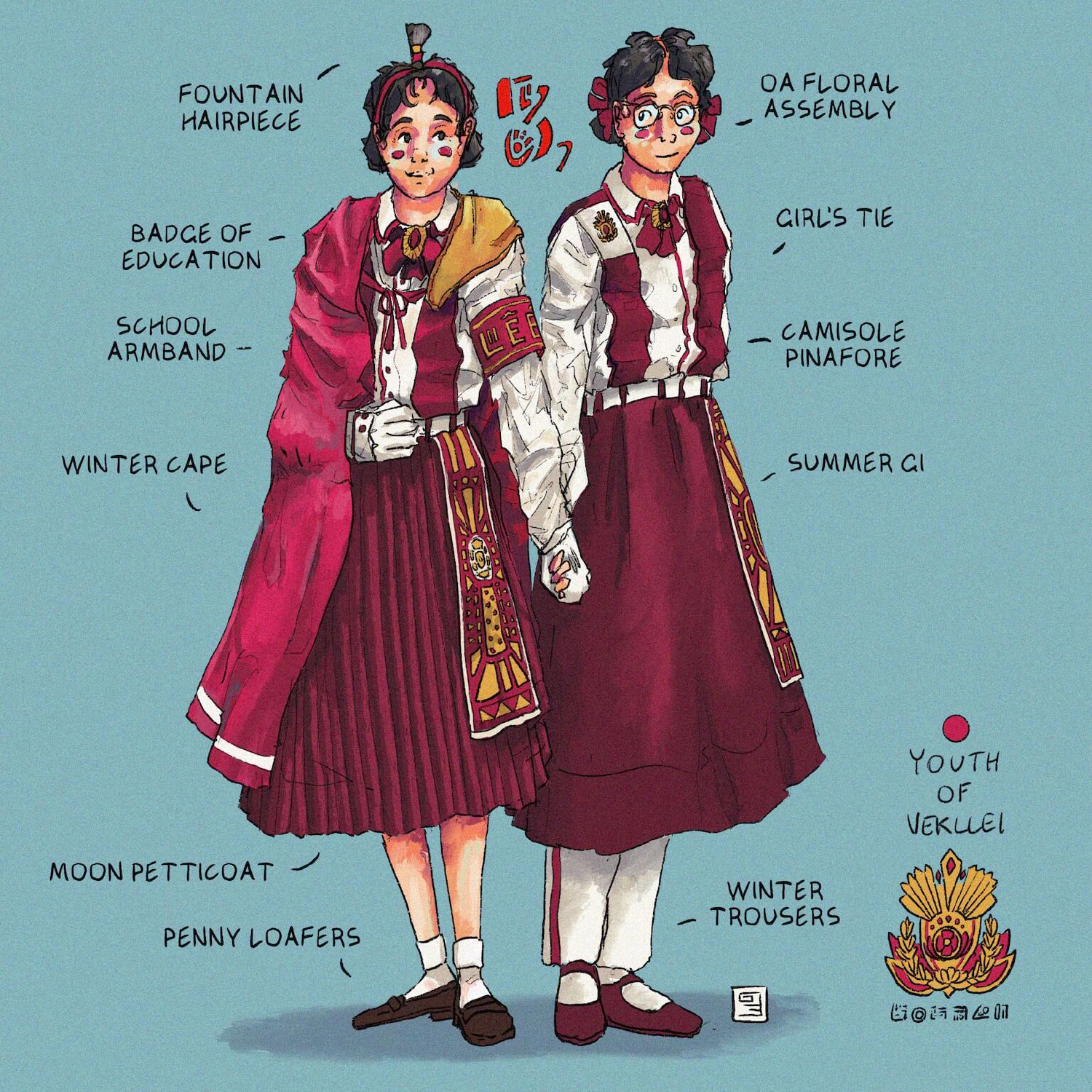 For the students of Vekllei, a single uniform is distributed across all ages of schooling, from preschool right through university and miscellaneous higher education. For girls, it is highly modular and incorporates important cultural items of clothing, like the gi quarter-pleat, temple and fountain hairpieces, and overskirt lace aprons called sun petticoats (in ceremony). Although Vekllei was once cold year-round, today it sees warm summers and mild winters that encourage distinct summer and winter fashions. A girl’s preference in uniforms may cycle through many styles over her schooling years, from spartan minimalism in high school (of just an armband, white shirt and red skirt) to decadent ceremony in her university years.